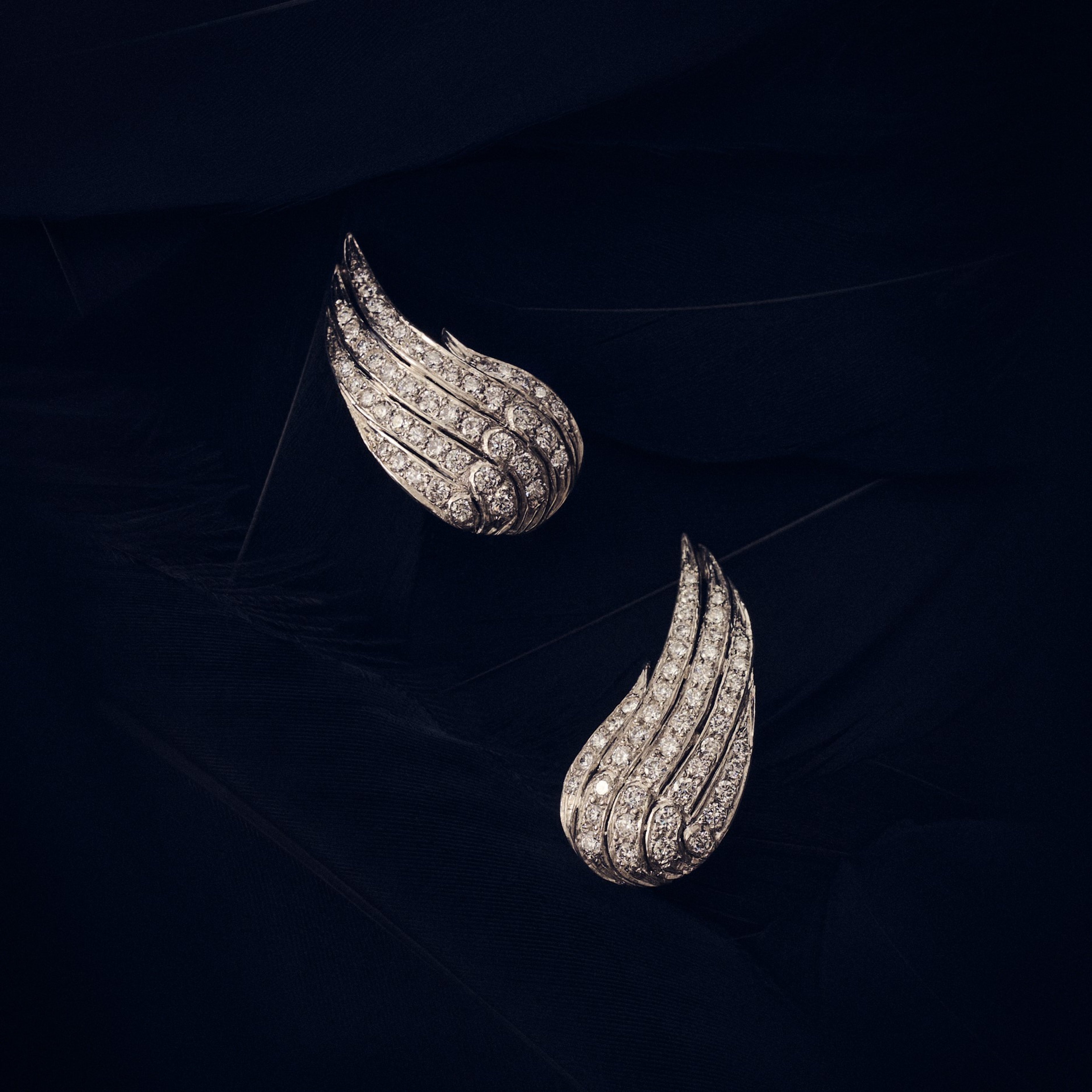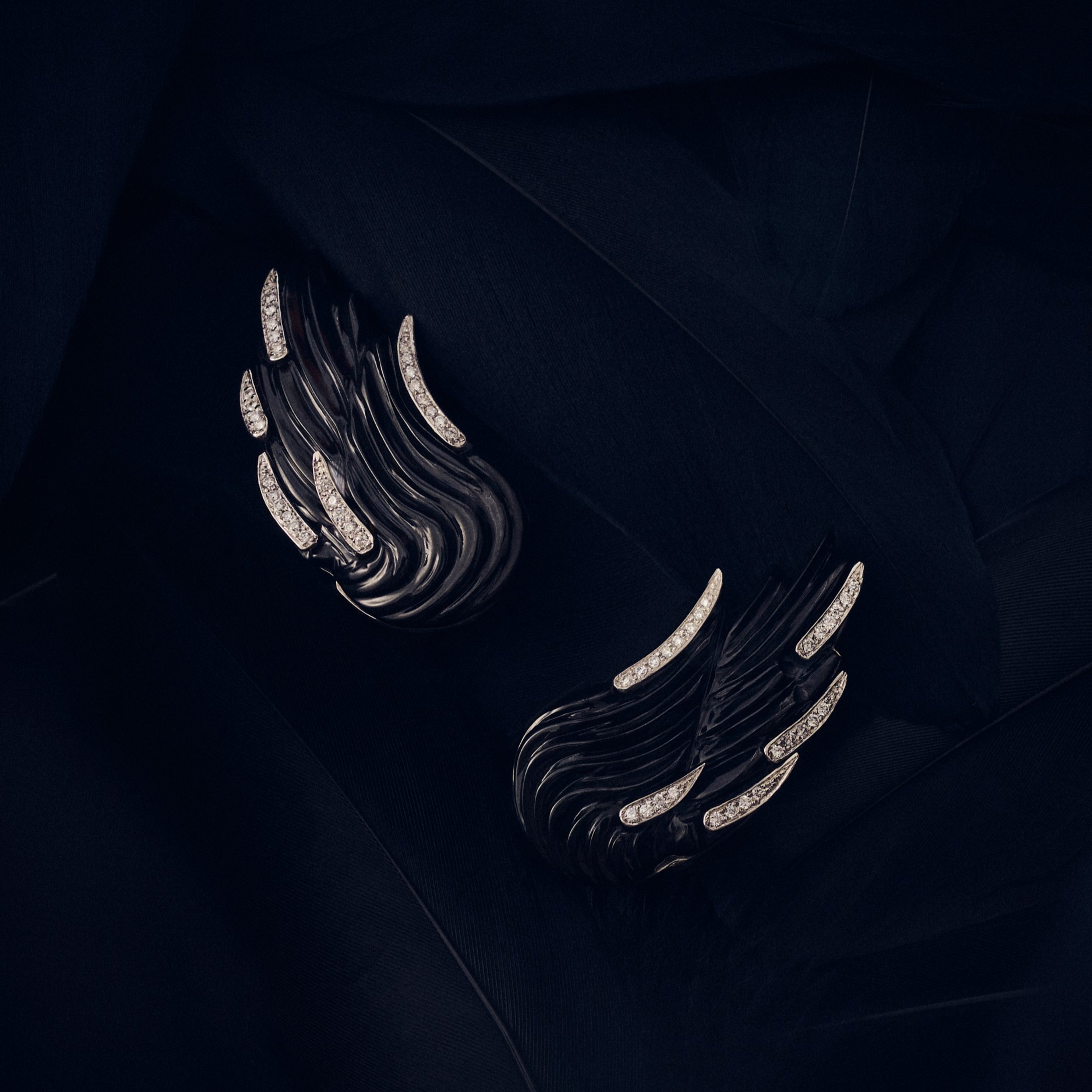 The collection also features two unique pieces: a pair of wing earrings in hand-carved frosted rock crystal and diamonds, and another in hand-carved black jade and diamonds set in platinum.