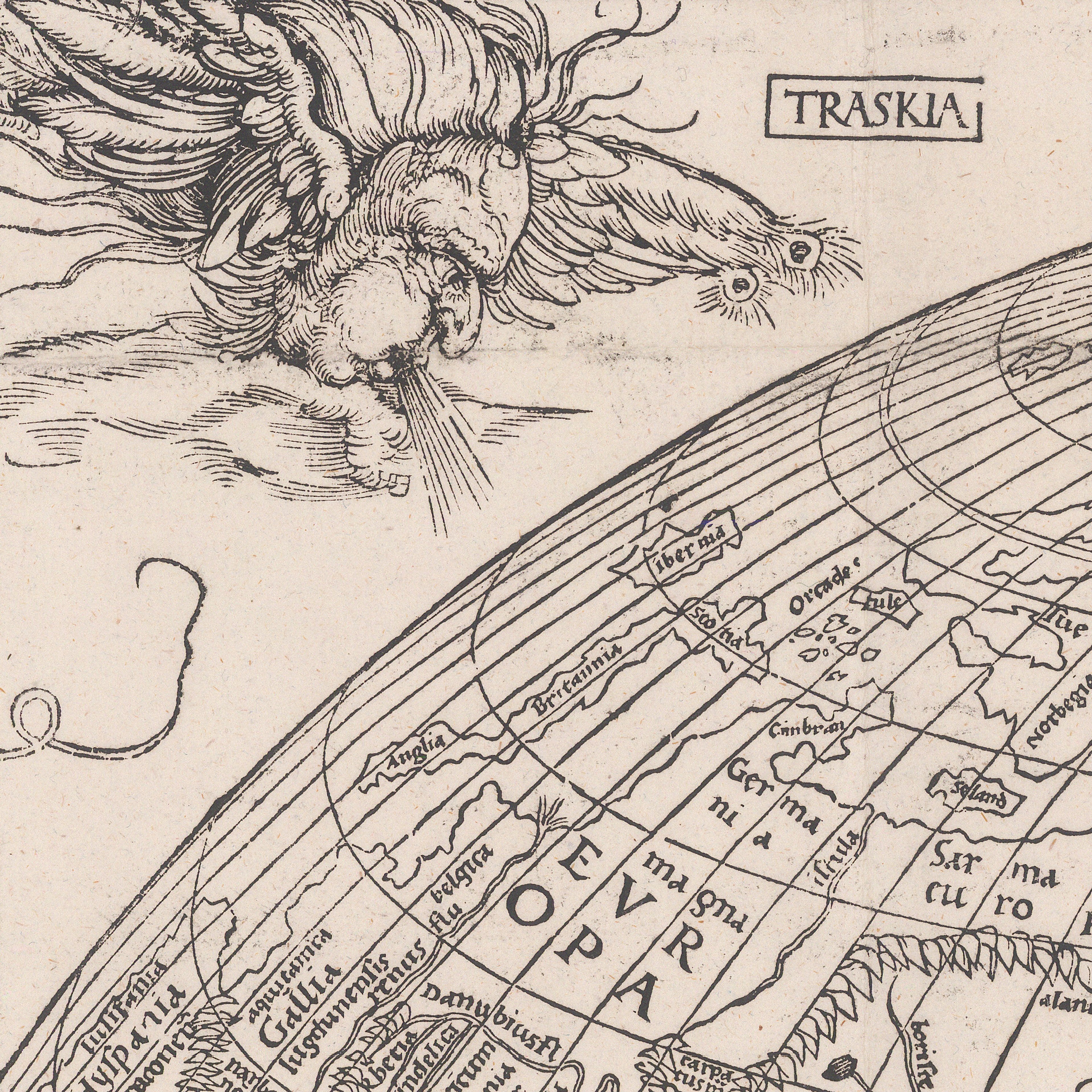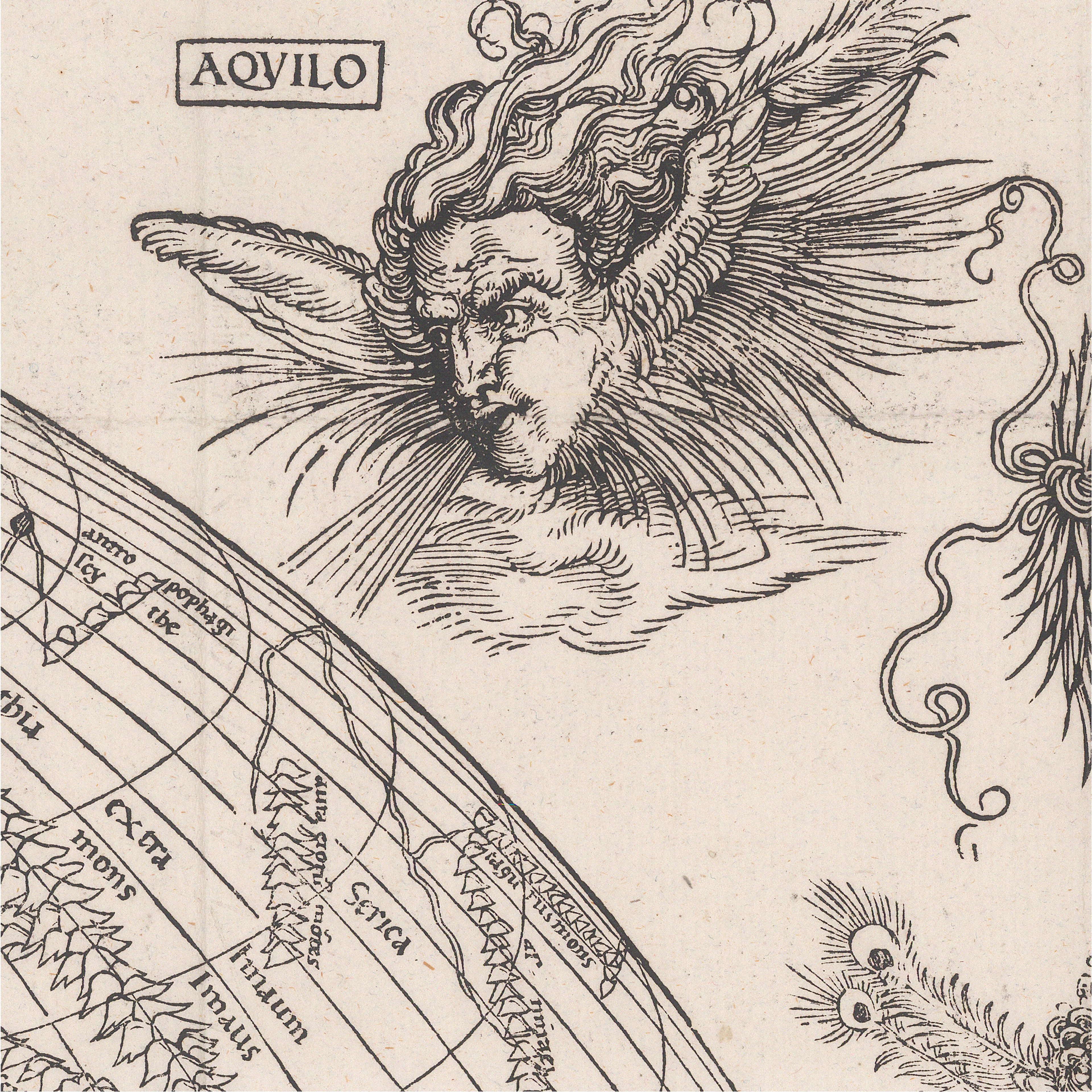 Dürer's map is an important early representation of the Earth created from a carved woodblock. This large and dynamic work is the first known printed illustration of the Earth as a three-dimensional orb. The Earth is surrounded by twelve wonderfully detailed windheads, each with unique characteristics and full of energy.