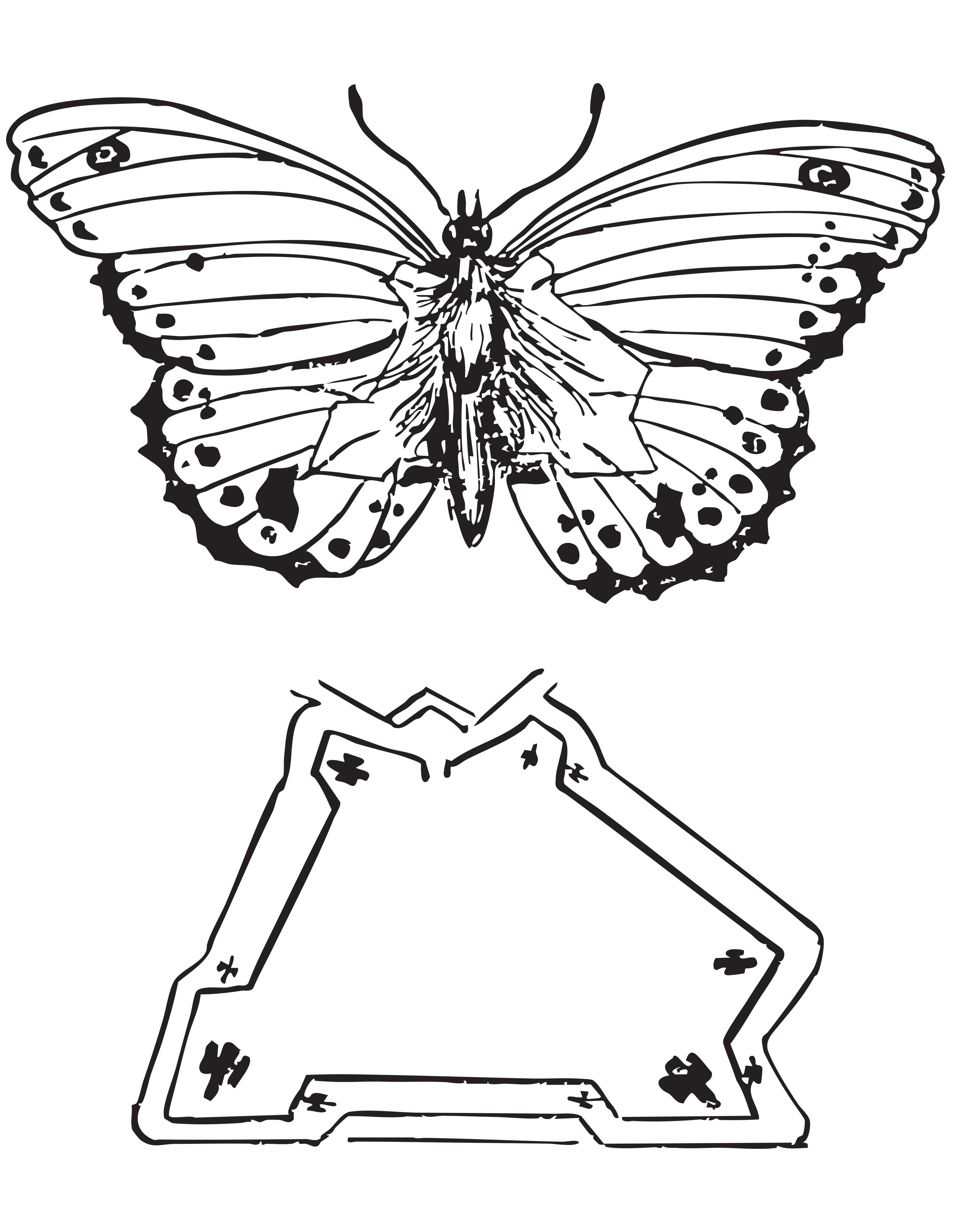 "This sketch of a butterfly contains the outline of a fortress, and marks both the position and power of the guns. The marks on the wings between the lines mean nothing, but those on the lines show the nature and size of the guns, according to the keys below."