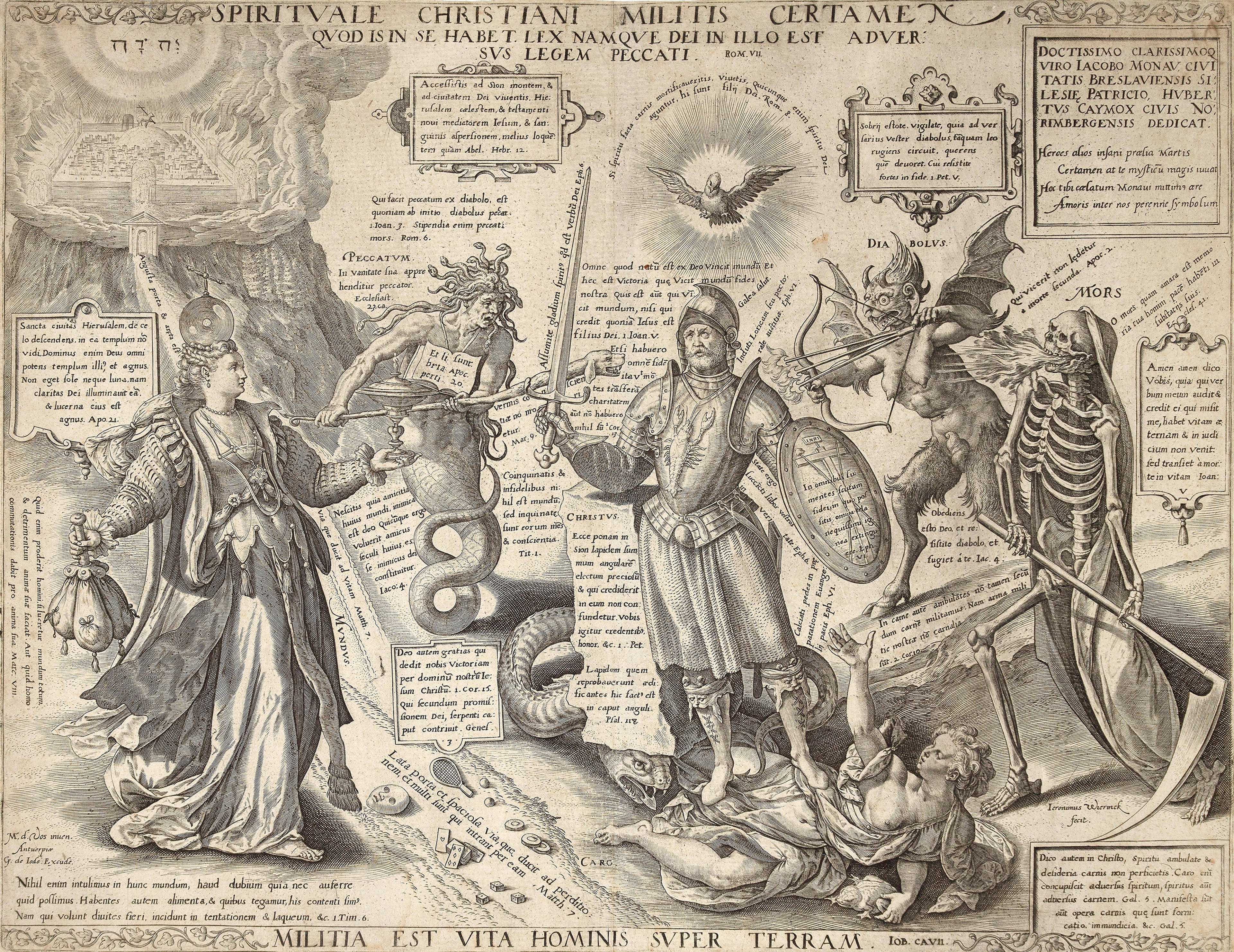 In the fore of the map, there are powerful depictions of the philosophical allegories; the Christian Knight and the King fighting the Rulers of Darkness: Vanity, Sin, Carnal Weakness, the Devil and Death. This imagery was taken from a rare broadside print of an illustration by Maerten de Vos titled, “The Christian Soldier’s Spiritual Struggle”, here engraved by Hieronymous Wierix and published by Gerard de Jode, 1580.