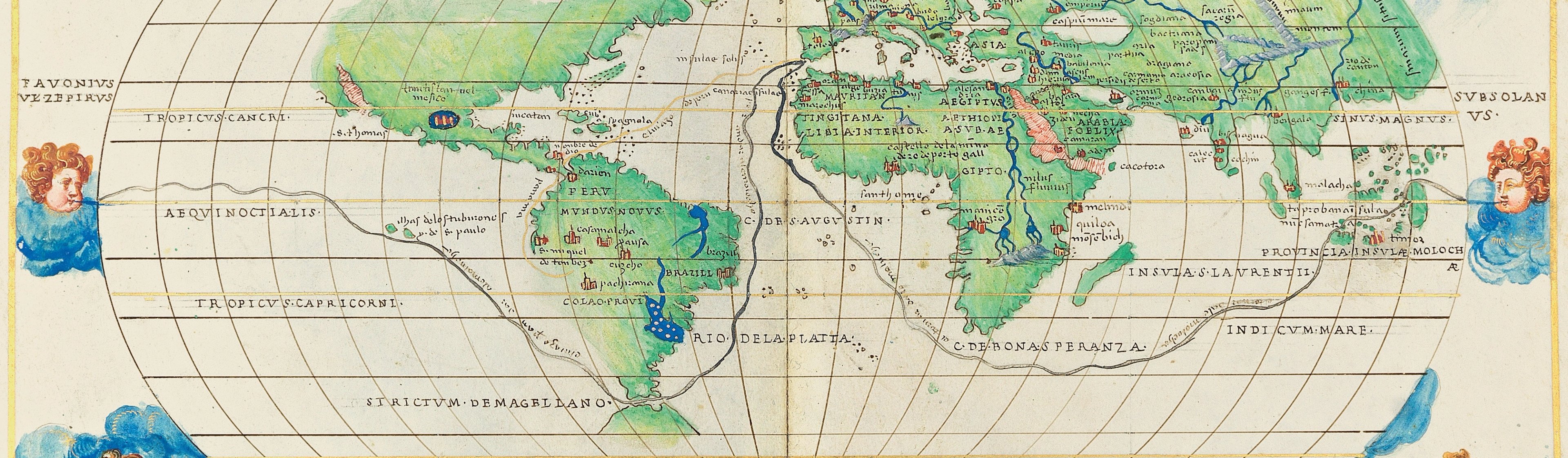 This striking oval-projection map shows the world as it was known in the mid-sixteenth century. The continents are painted in lush green: the unknown coastlines of northern America and Asia dissolve into the distance, and there is a complete omission of land inside the Antarctic Circle. Major settlements are identified with red and gold icons, and a selection of physical features such as mountains, rivers and lakes are also carefully drawn onto the map. The world is surrounded by the 12 personified winds, each suspended above the Earth in a flurry of blue clouds.