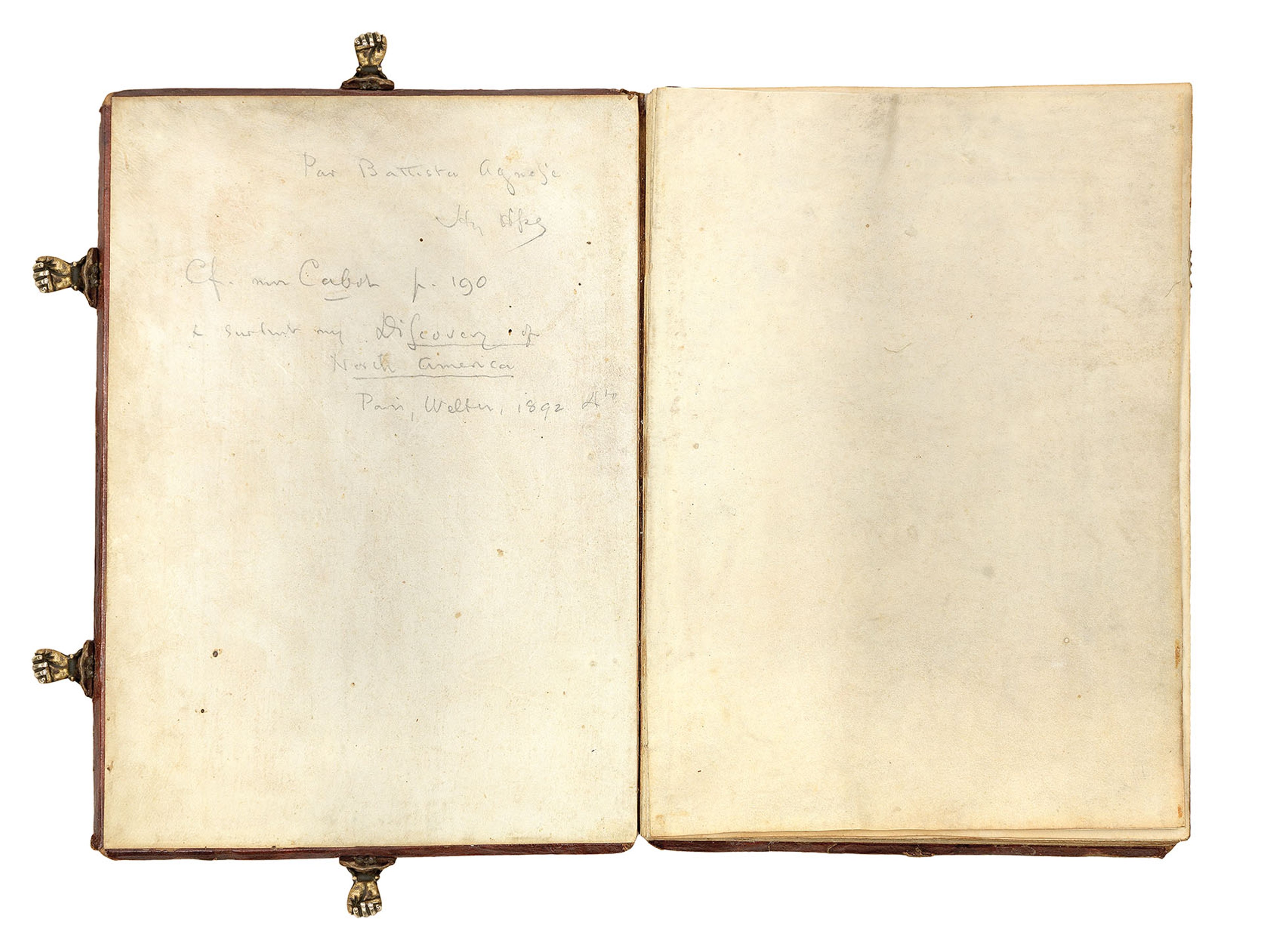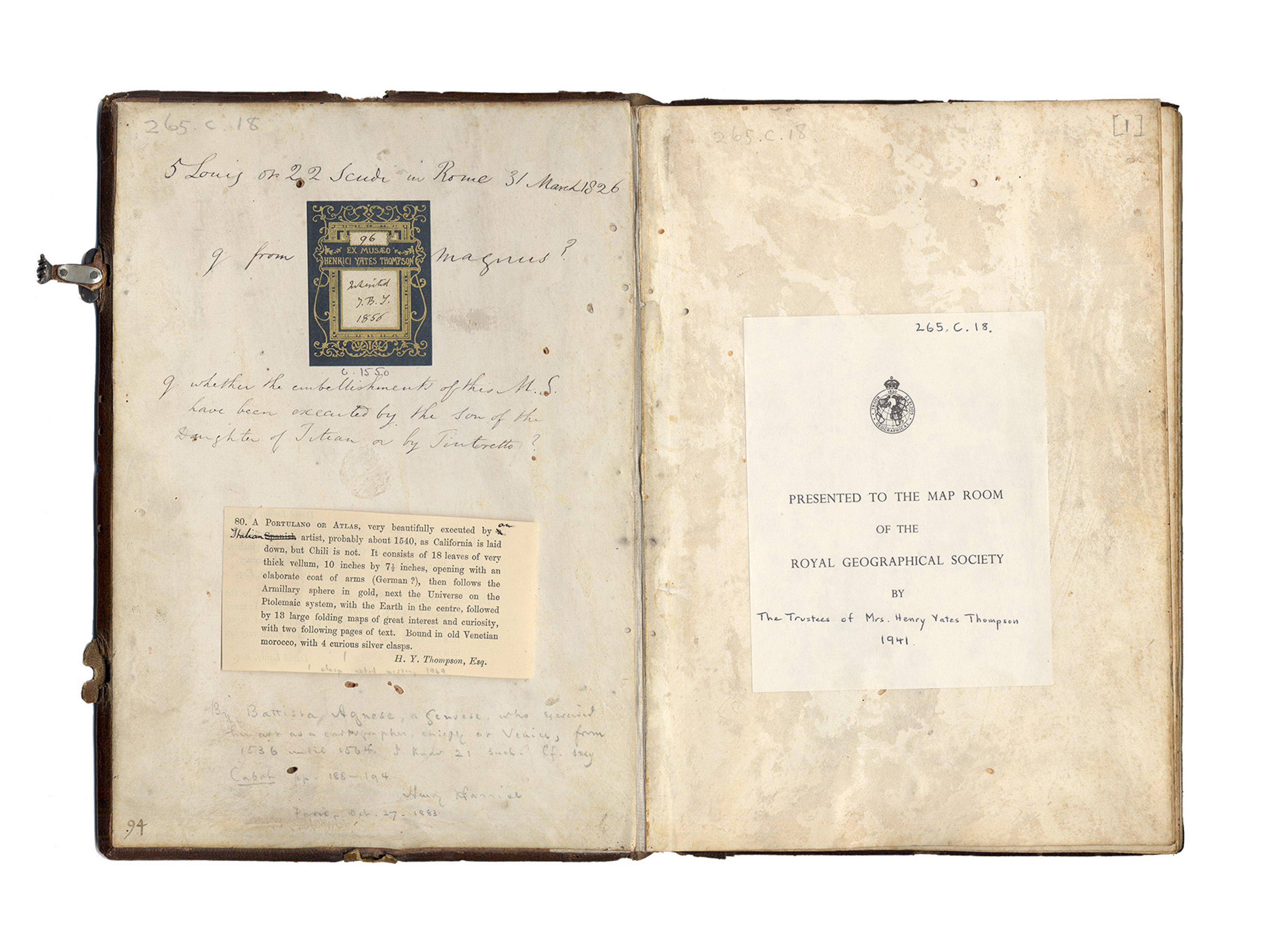 The Sunderland Collection and the RGS manuscripts each have their own distinguished provenance: the former from the collection of the eminent cartographic historian Henry Harisse (1829–1910), and the latter having been donated to the RGS by the family of British collector and author Henry Yates Thompson (1838-1928). Both works feature annotations from Harisse, who - as a specialist scholar on Agnese - was said to have inscribed the end papers of each copy in circulation to confirm their authenticity.