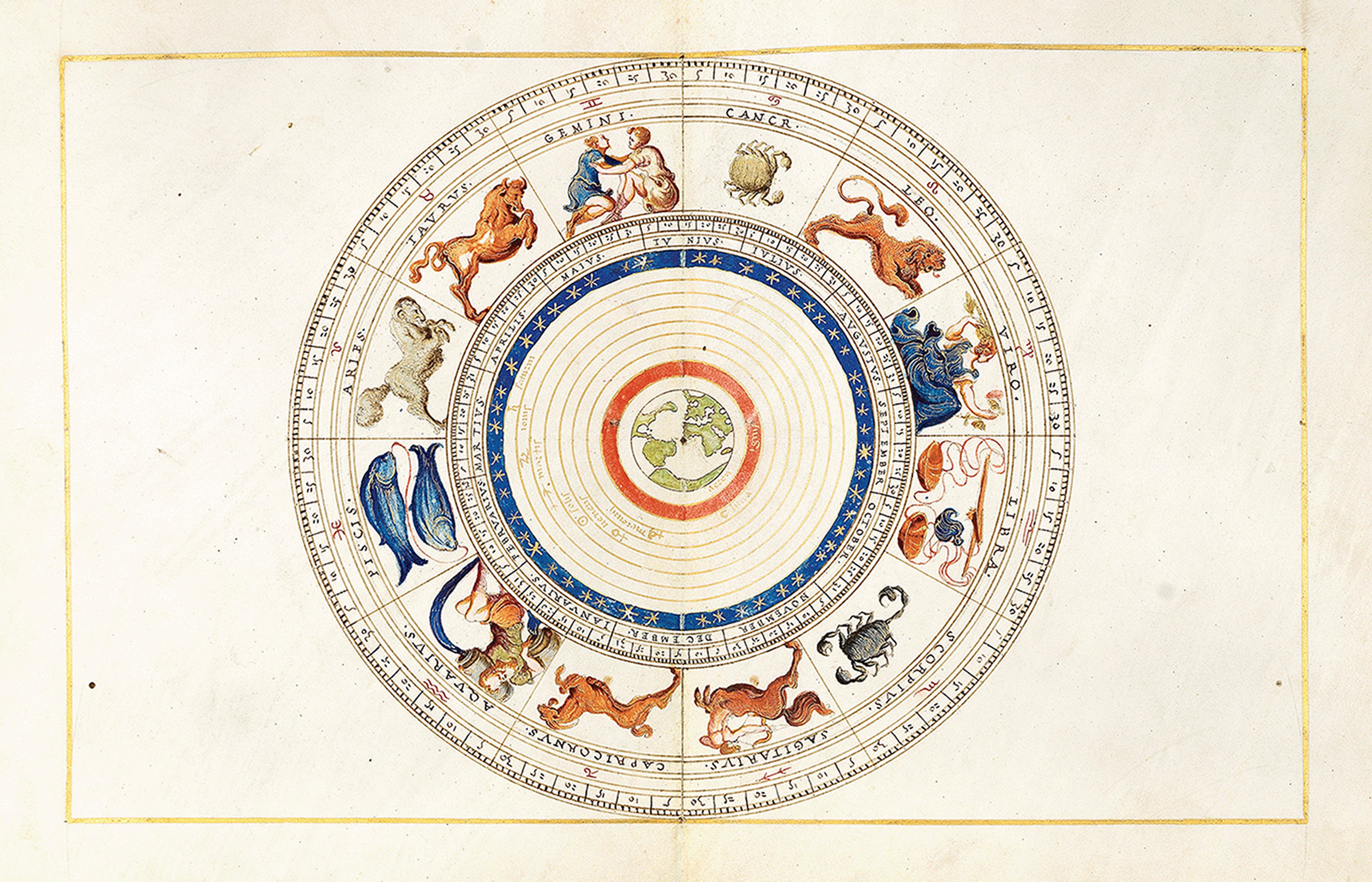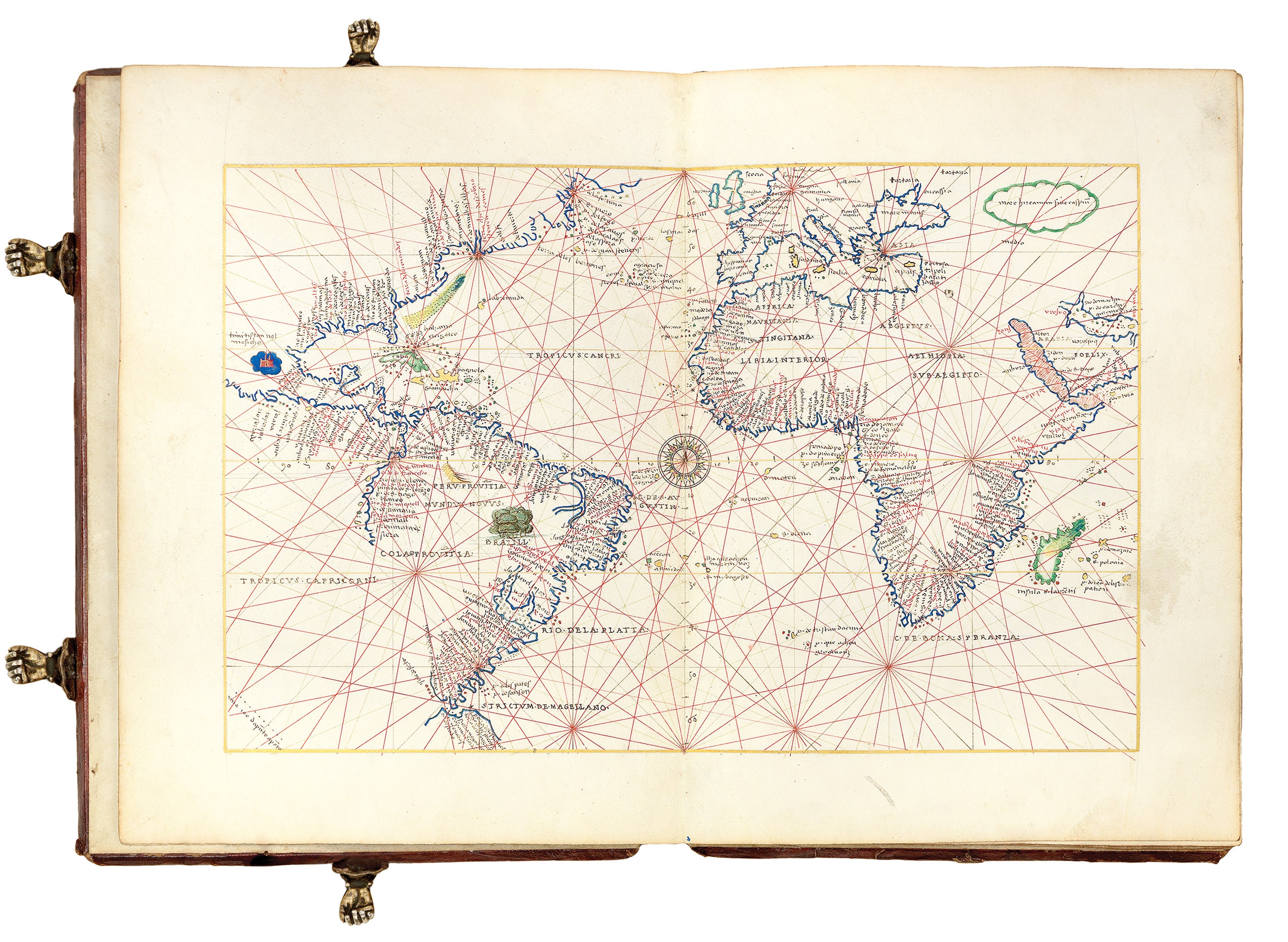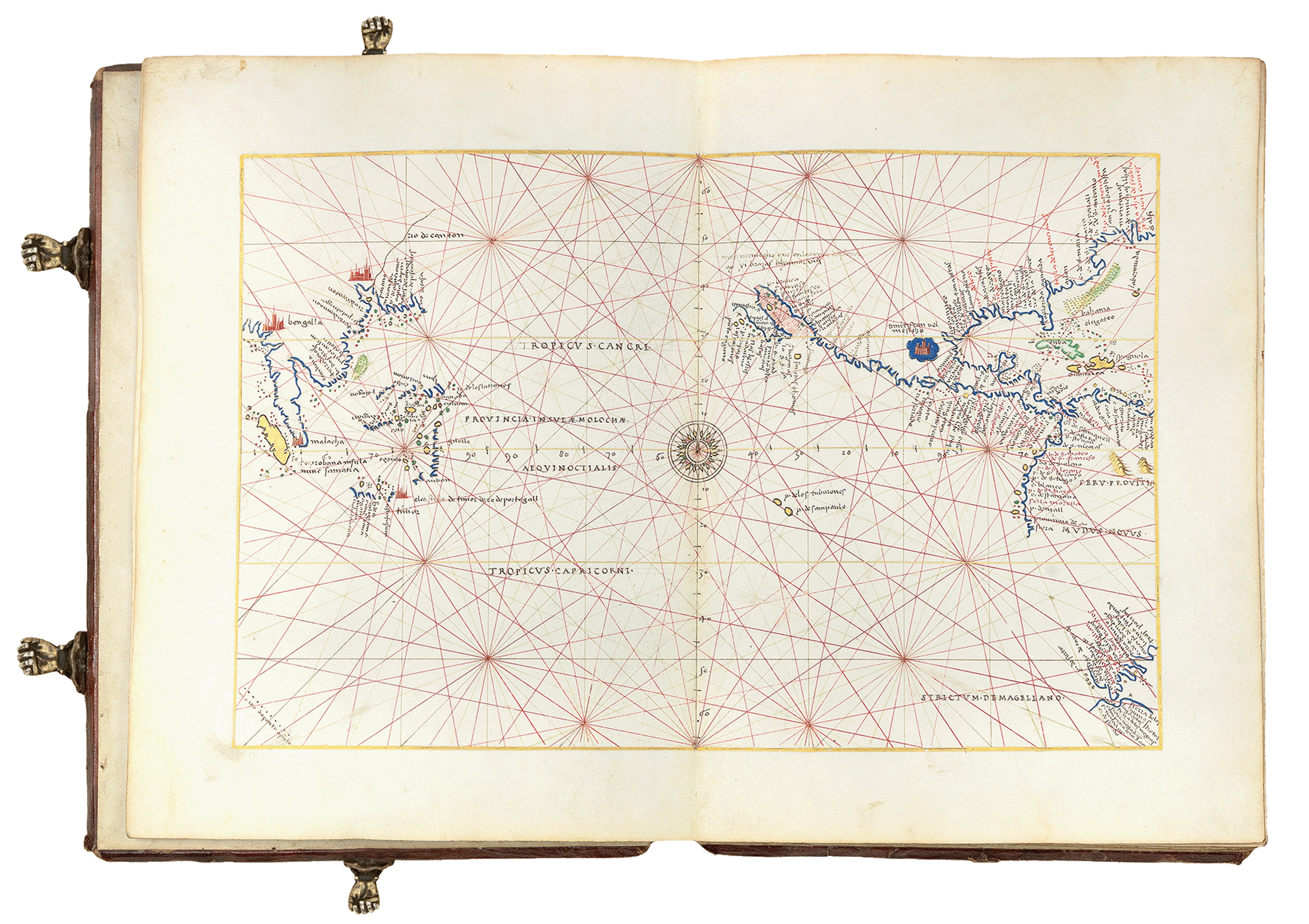 Each example of the Agnese atlas contains a handsome diagram of the zodiac, with a functioning 32-point compass inset into the lower board, and a short treatise in Latin on cosmographical dimensions. Both The Sunderland Collection and the RGS examples of this work are also presented in their original gold-tooled, red Morocco leather bindings with small clasps in the shape of hands.