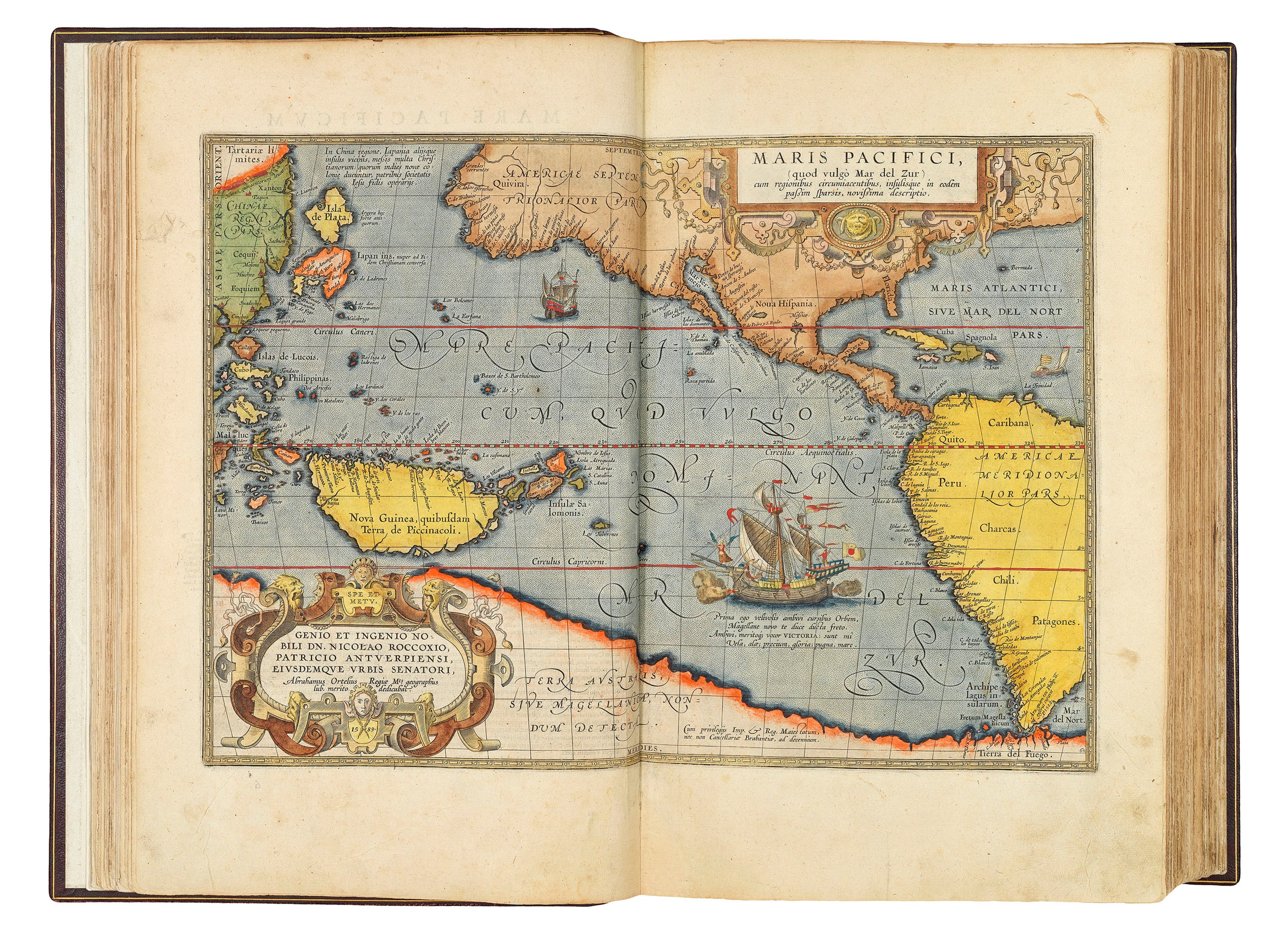 Celebrated map of the Pacific with a large vignette of Magellan's ship 'Victoria', from Ortelius' atlas the 'Theatrum Orbis Terrarum' (1603).