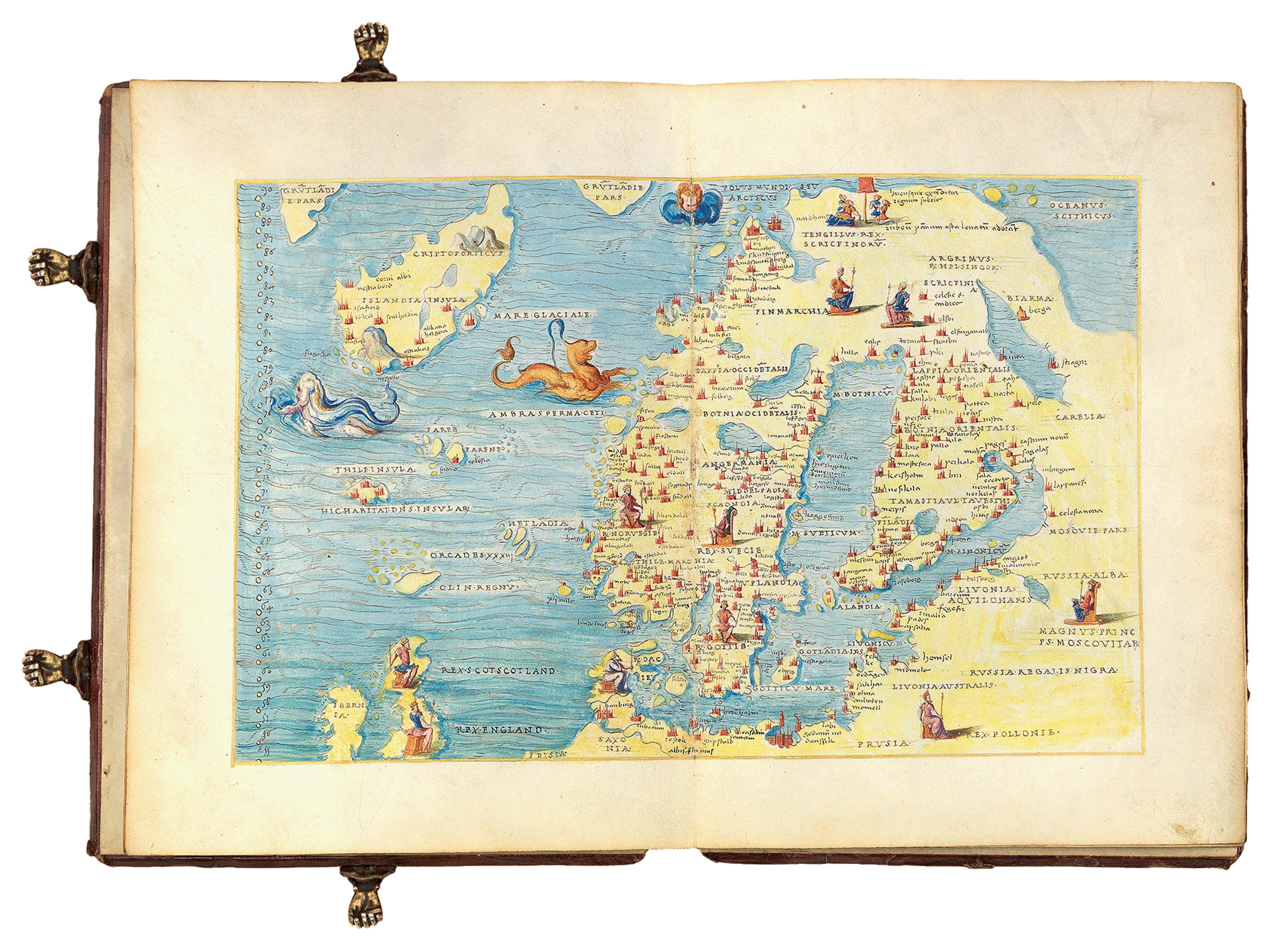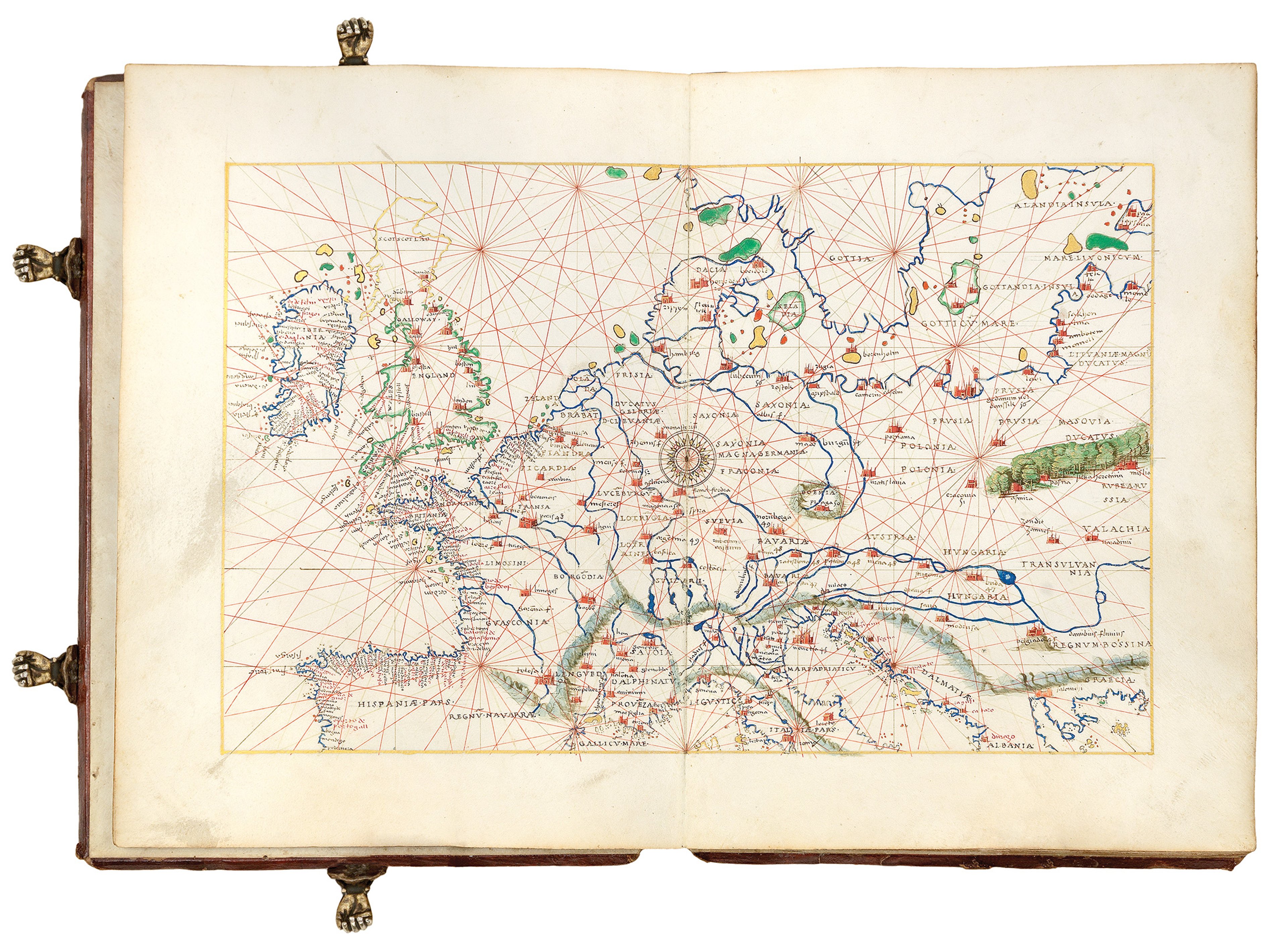 With the exception of the map of Scandinavia, Agnese has chosen to present the maps in an ‘antiqued’ style as opposed to using intaglio printing. This opulent illuminated manuscript style is an informed artistic decision and a nod to earlier decadent works; but the maps nonetheless include all of the latest geographical ‘discoveries’. Each atlas would have been an elite object with a high price tag!