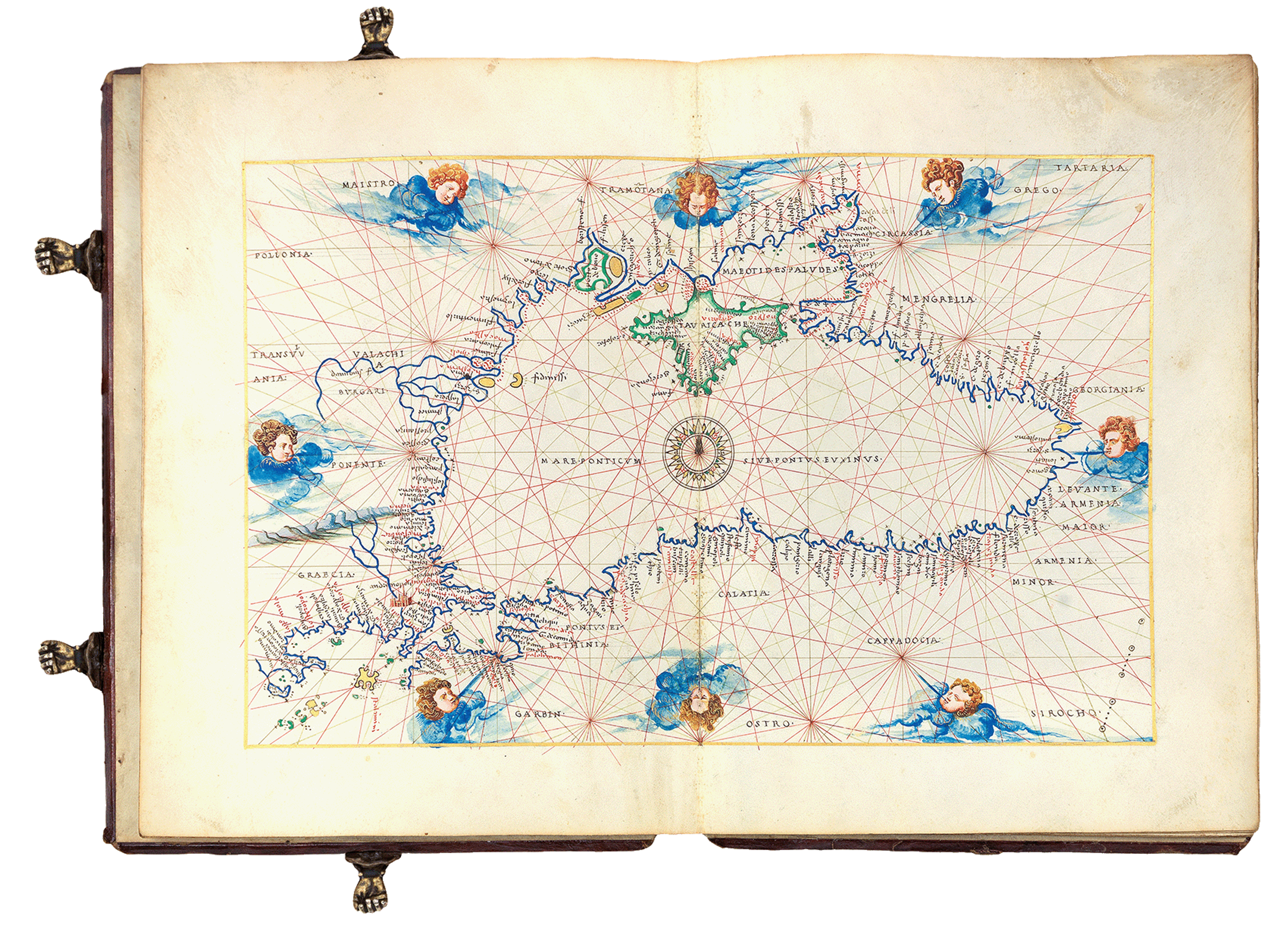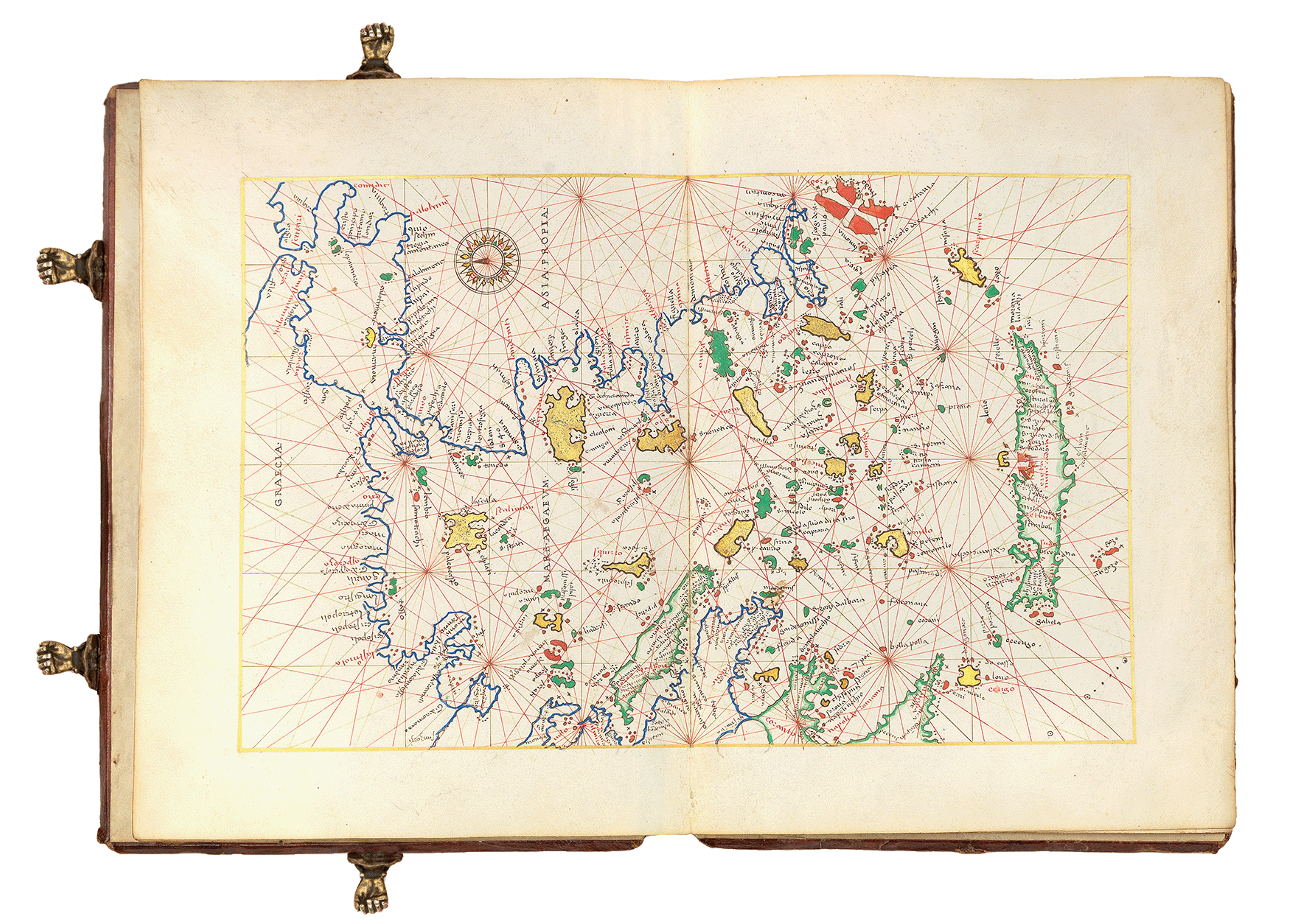 It is one of 13 charts in this exquisite portolan atlas. Each detail-rich map is hand-drawn on vellum, and the entire work is heightened in gold and silver.