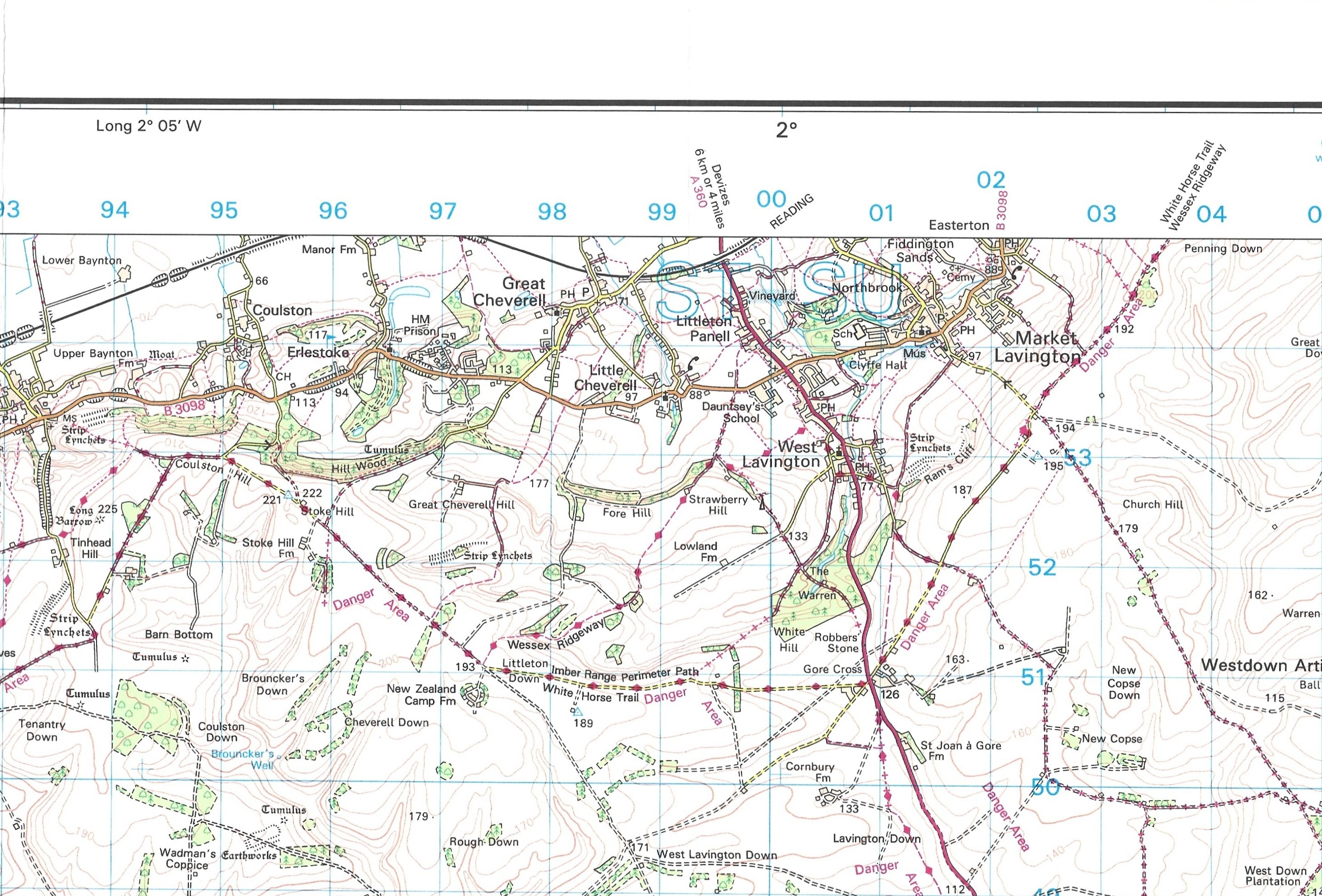 Nicholas used his own copy of this map to navigate across Salisbury Plain during his Two Degrees West expedition. Adhering to his strict rules of following this 'longitudinal tightrope' meant that he had to gain special permissions to travel through the active training zone on the Plain and the RAF base at MOD Lyneham (near Chippenham).