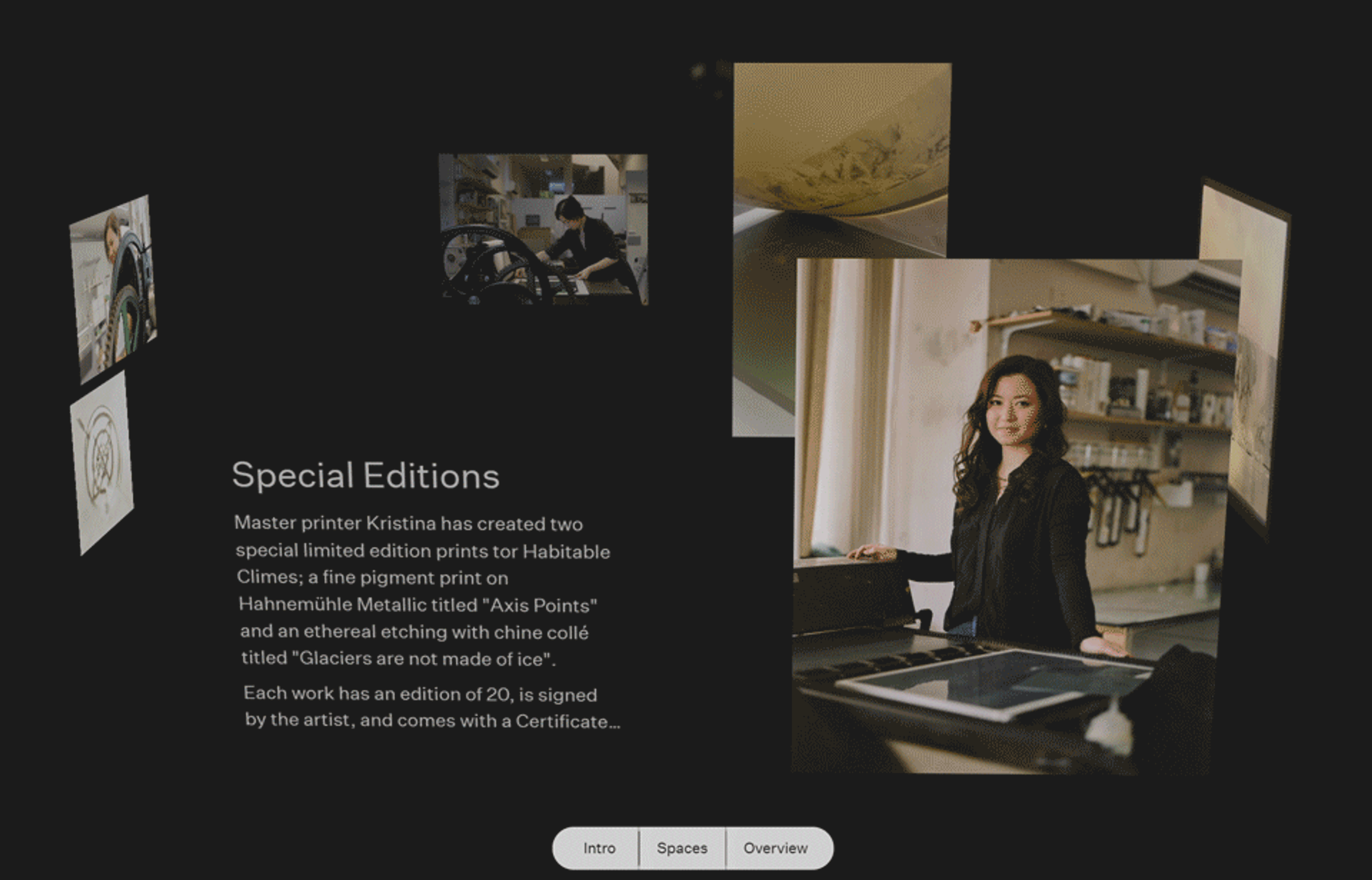 If you would like an accessible static view of the gallery space, which contains all of the imagery and information but lacks the animation, click 'Overview' and this will present the exhibition in a simple, scrollable layout.
