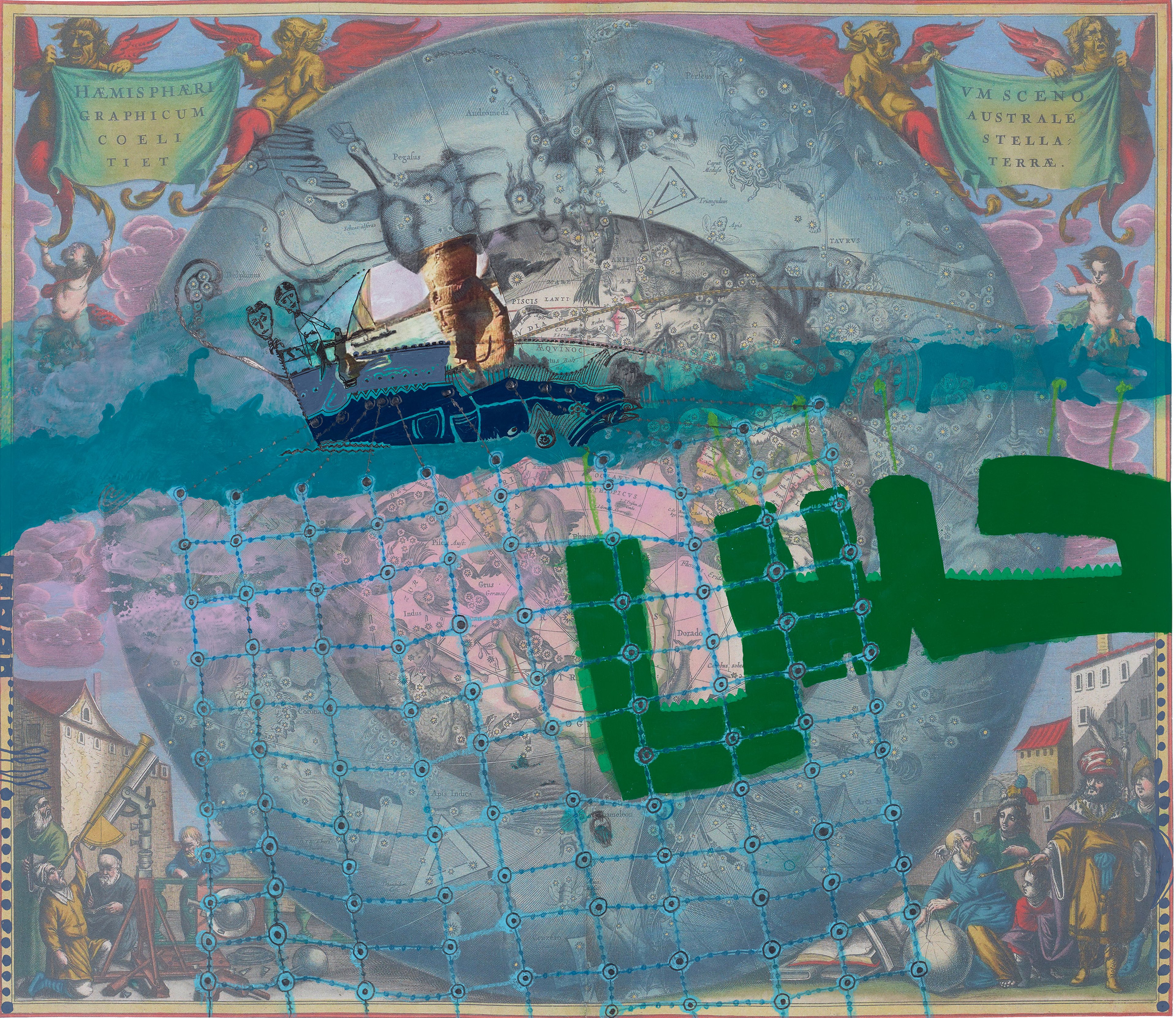 In his response to items from The Sunderland Collection, Hassan explored the layered stories of the cartographic objects, reflecting on themes of displacement and global interconnectedness. The resulting works are richly textured mixed-media compositions combining collage, print, pencil, and gouache, interweaving autobiographical elements with historical references. Recurring motifs include animals from his childhood, crescent moons, and Nubian warriors, alongside symbols of migration such as the felucca boats associated with the flooding of Nubia in 1952. You can enjoy the online exhibition for Shifting Sands here.