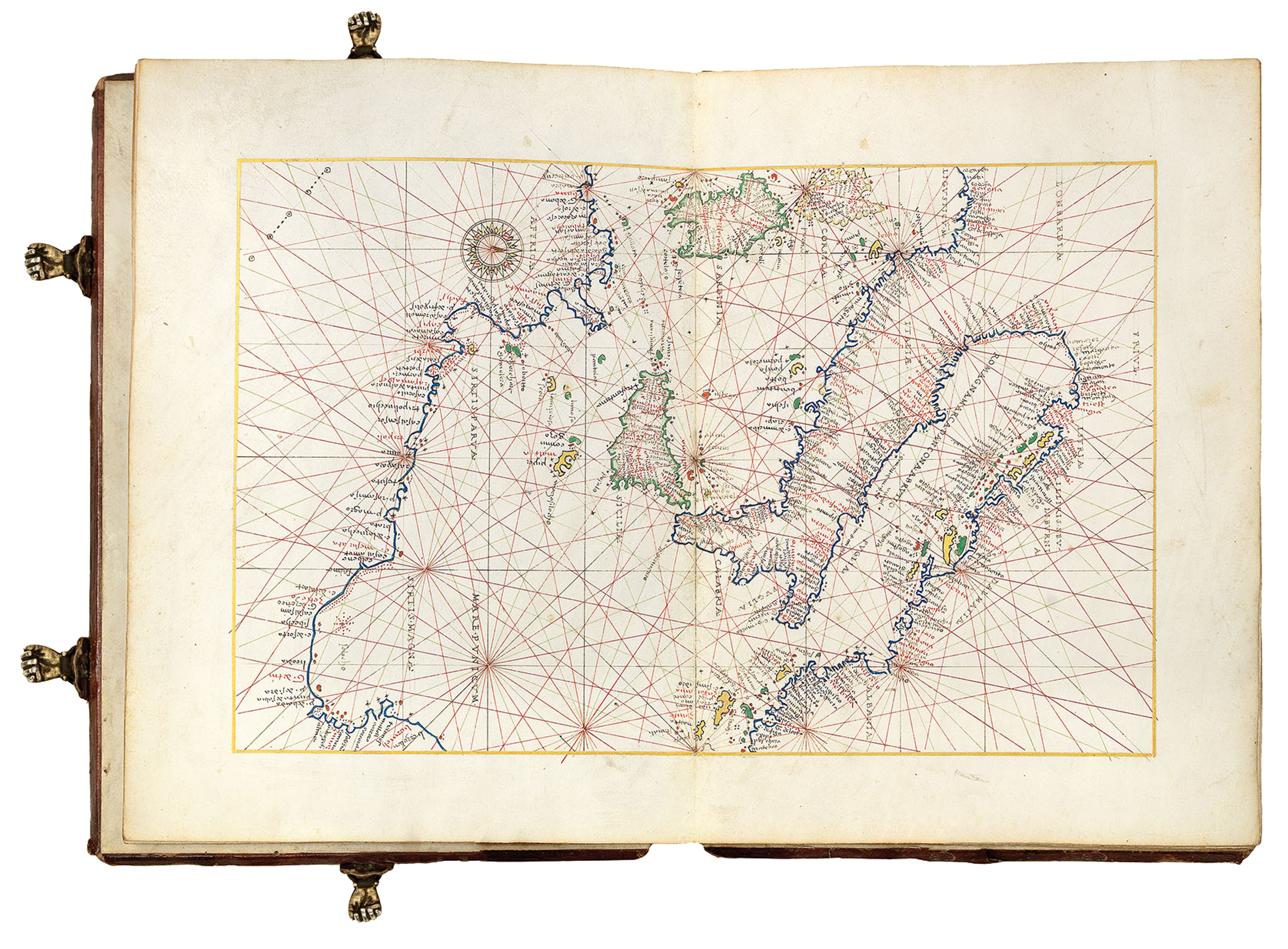 Back to people overviewAlso known as a wind rose, the compass rose was a central feature of nearly all early navigational charts. It indicates direction so that the reader can orientate themselves when reading the chart. These tools could be very simple, with only a single pointer indicating north. They could also be far more complex, indicating the directions of North, South, East and West. Compass roses were often highly decorative. Some mapmakers had signature designs unique to themselves. They derive from the invention of the magnetic compass. Plácido Caloiro e Oliva and Joan Oliva’s portolan charts include decorative compass roses.