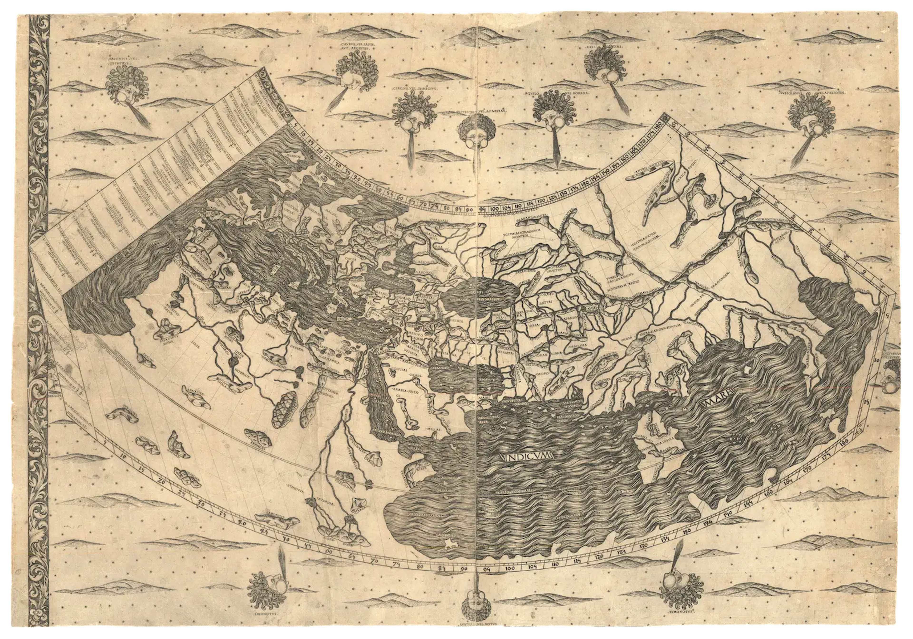 Back to people overviewA personification of a wind, usually appearing outside a map and blowing inwards. Derived from the classical wind roses designed by Aristotle, which preceded the compass rose. The wind roses had 12 directions: Boreas (N), Meses (NNE), Caecias (NE), Apeliotes (E), Eurus (SE), Orthonotus (SSE), Notus (S), Leuconotus (SSW), Lips (SW), Zephyrus (W), Iapyx (NW) and Thracias (NNW). The winds on maps are important because they influence navigation by sea, as well as the weather.