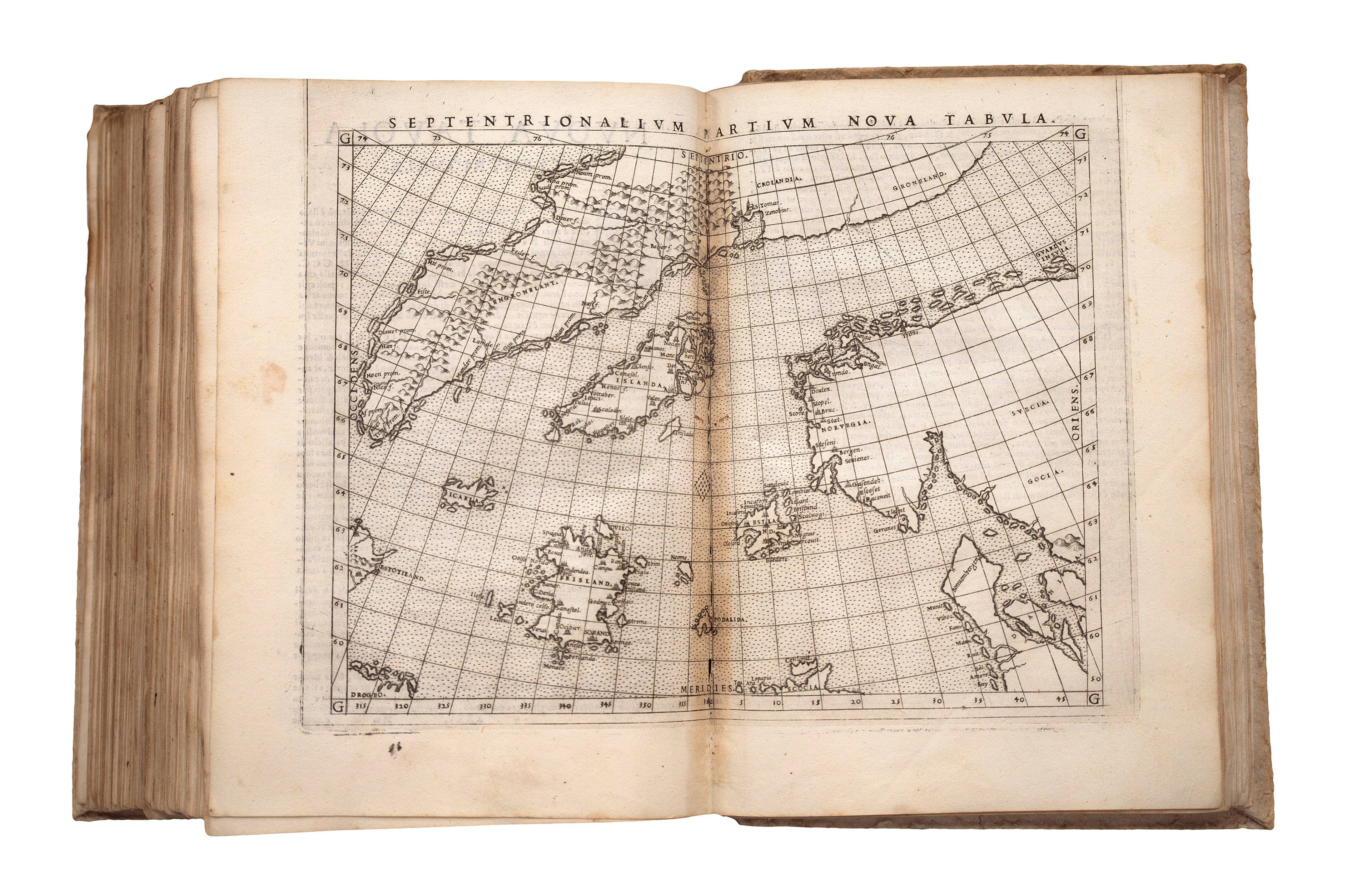 Ruscelli’s map of the British Isles is likely based on the 1546 chart by George Lily. Due to the reduction in size, the mapmaker removed many of the chart’s details such as place names. 'La Geografia' also contains the sea charts of Scandinavia and the North Atlantic based on the voyages of the Zeno brothers, Nicolò and Antonio, who had travelled to Greenland and supposedly to the mythical island of Friesland in 1380.