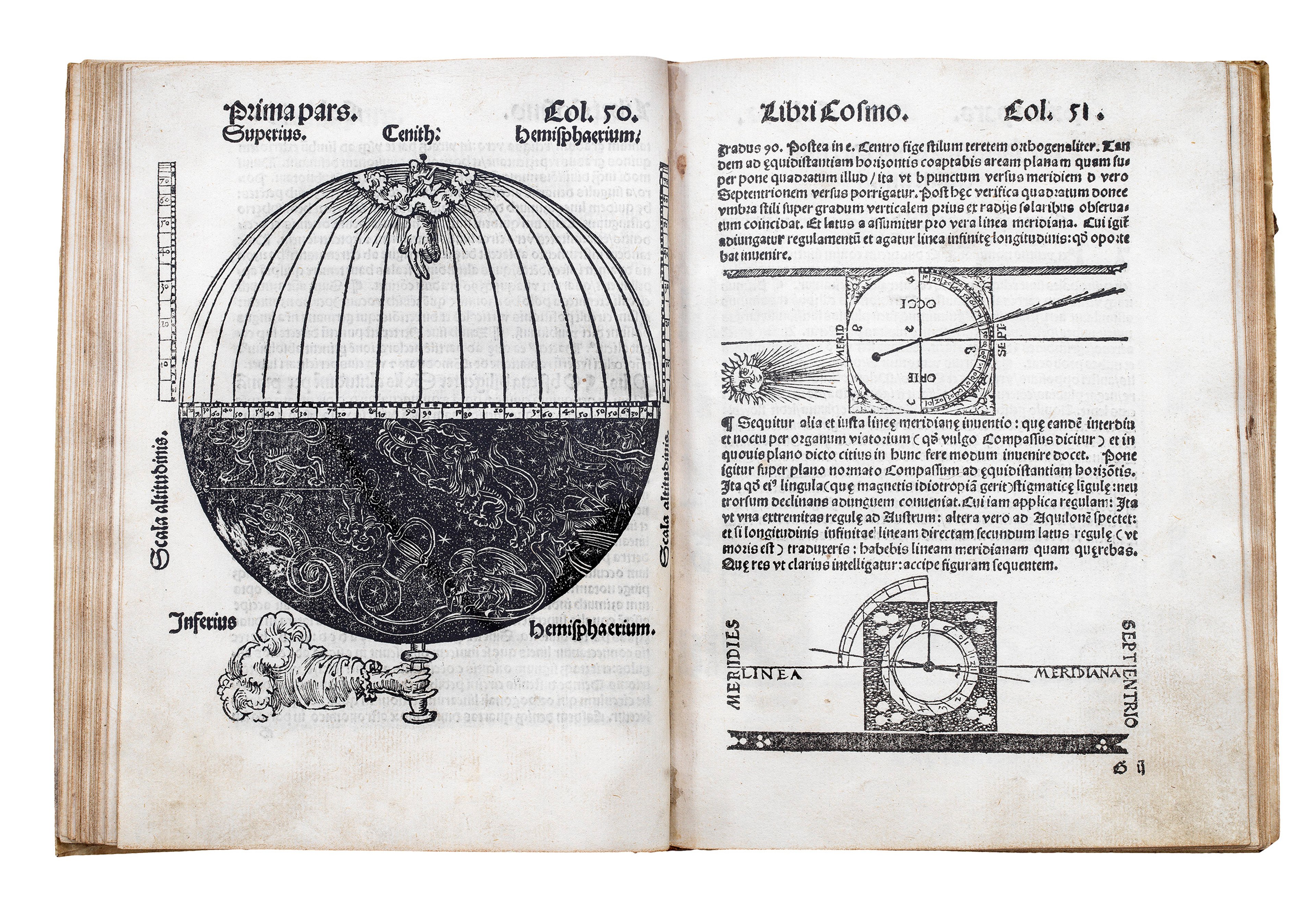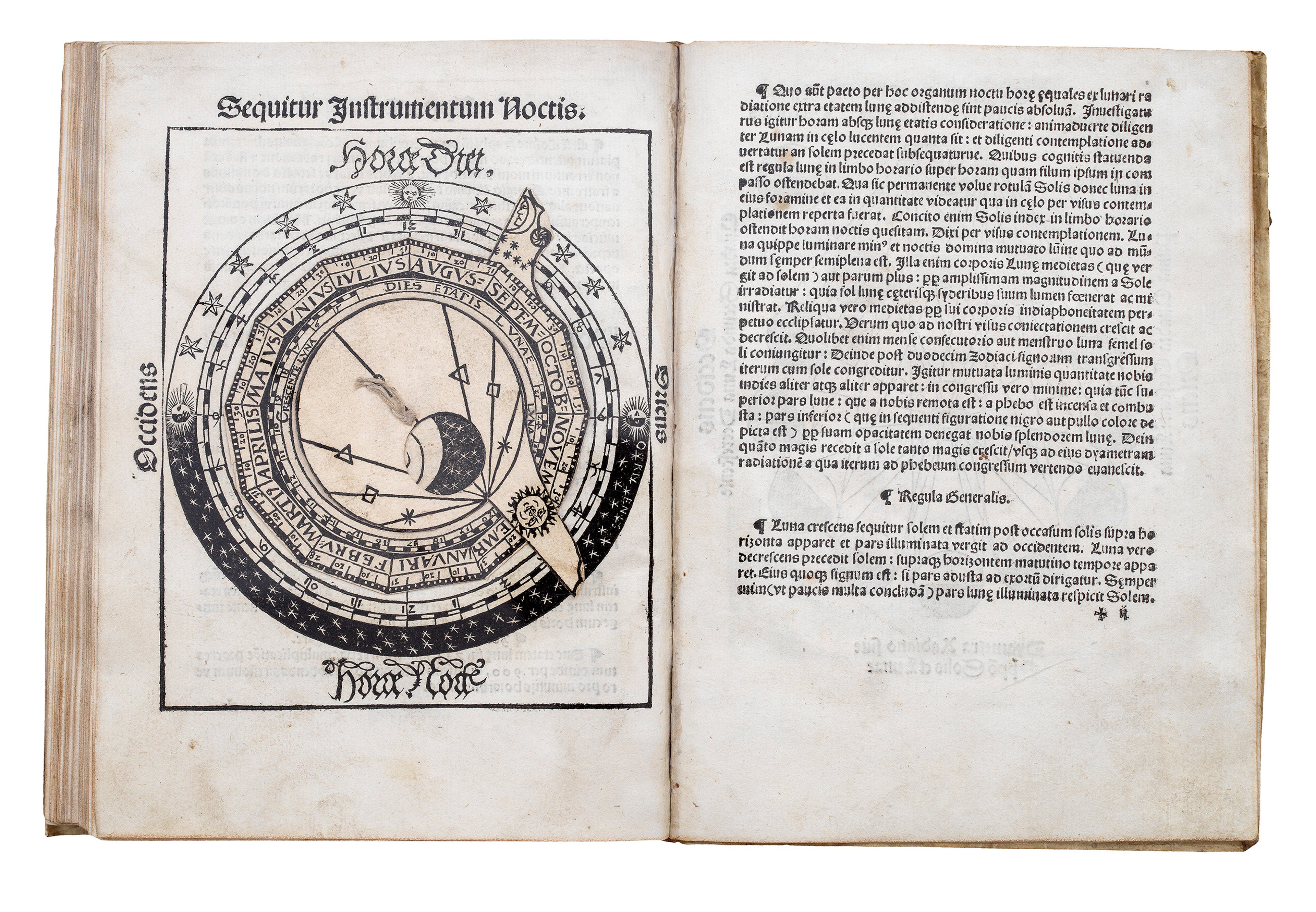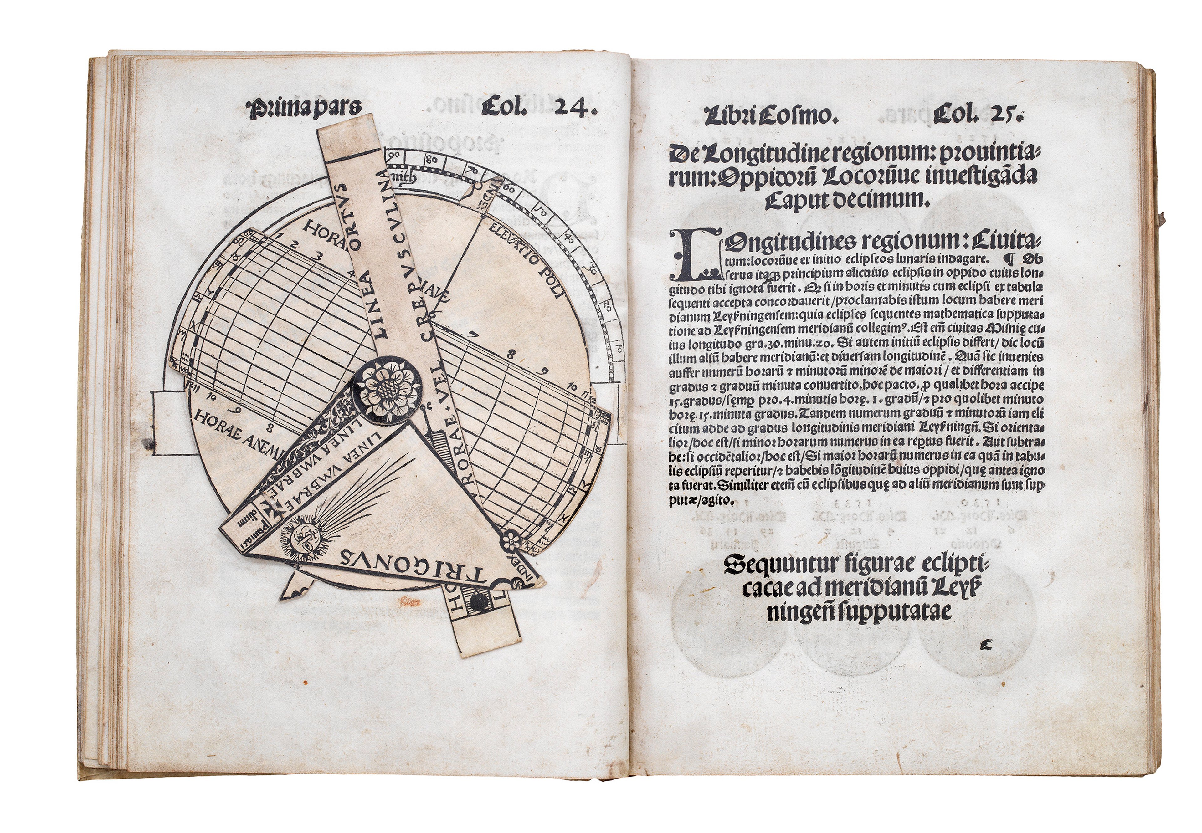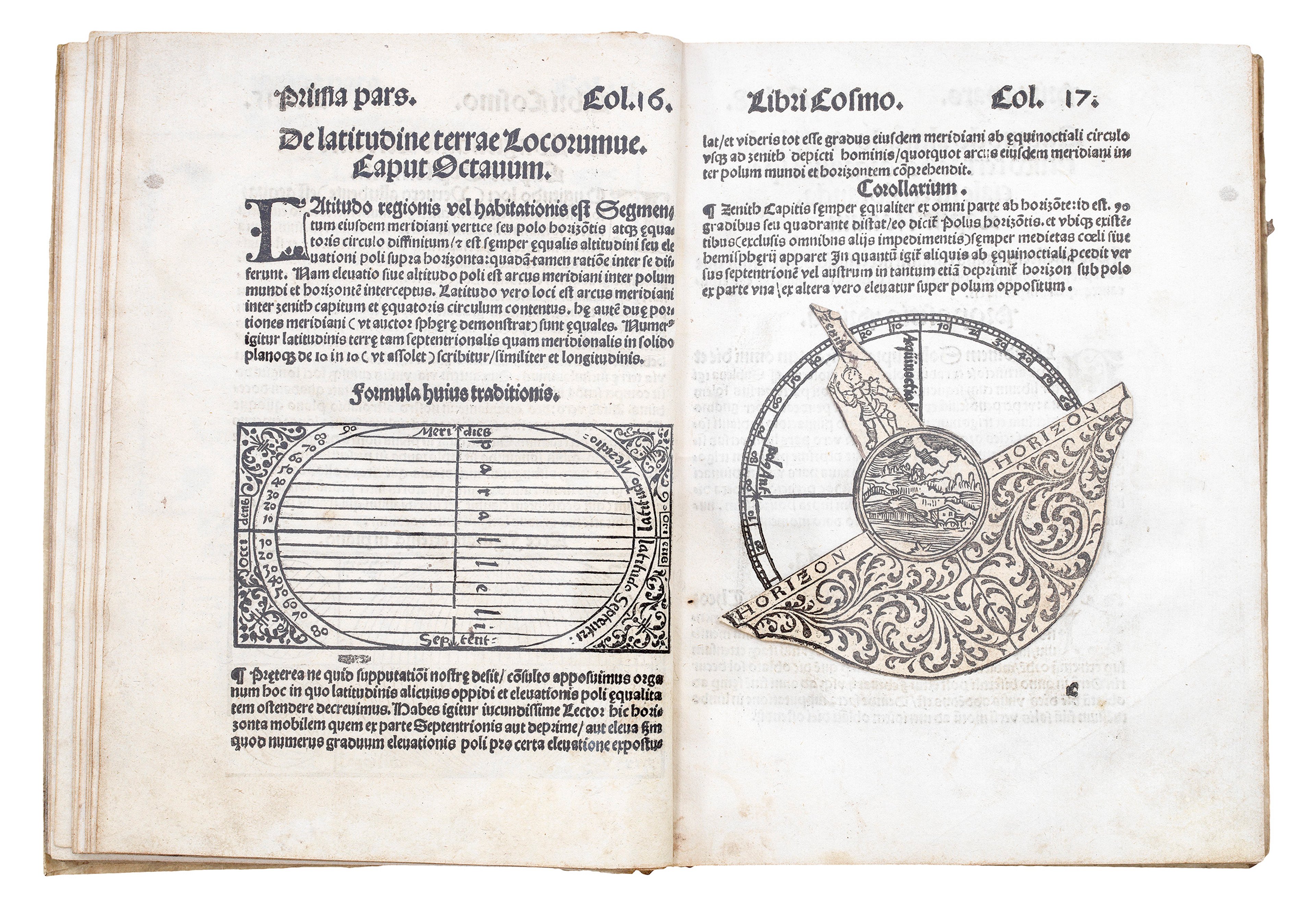 The 'Cosmographia' was a very popular practical manual that contained innovative adjustable moving paper instruments - known as volvelles. These translate astronomical principles into hands-on tools. Three full-size volvelles feature in the work, each modelled after more sophisticated brass devices such as astrolabes. Readers could use them to calculate time, latitude, or the Sun’s position relative to the horizon.