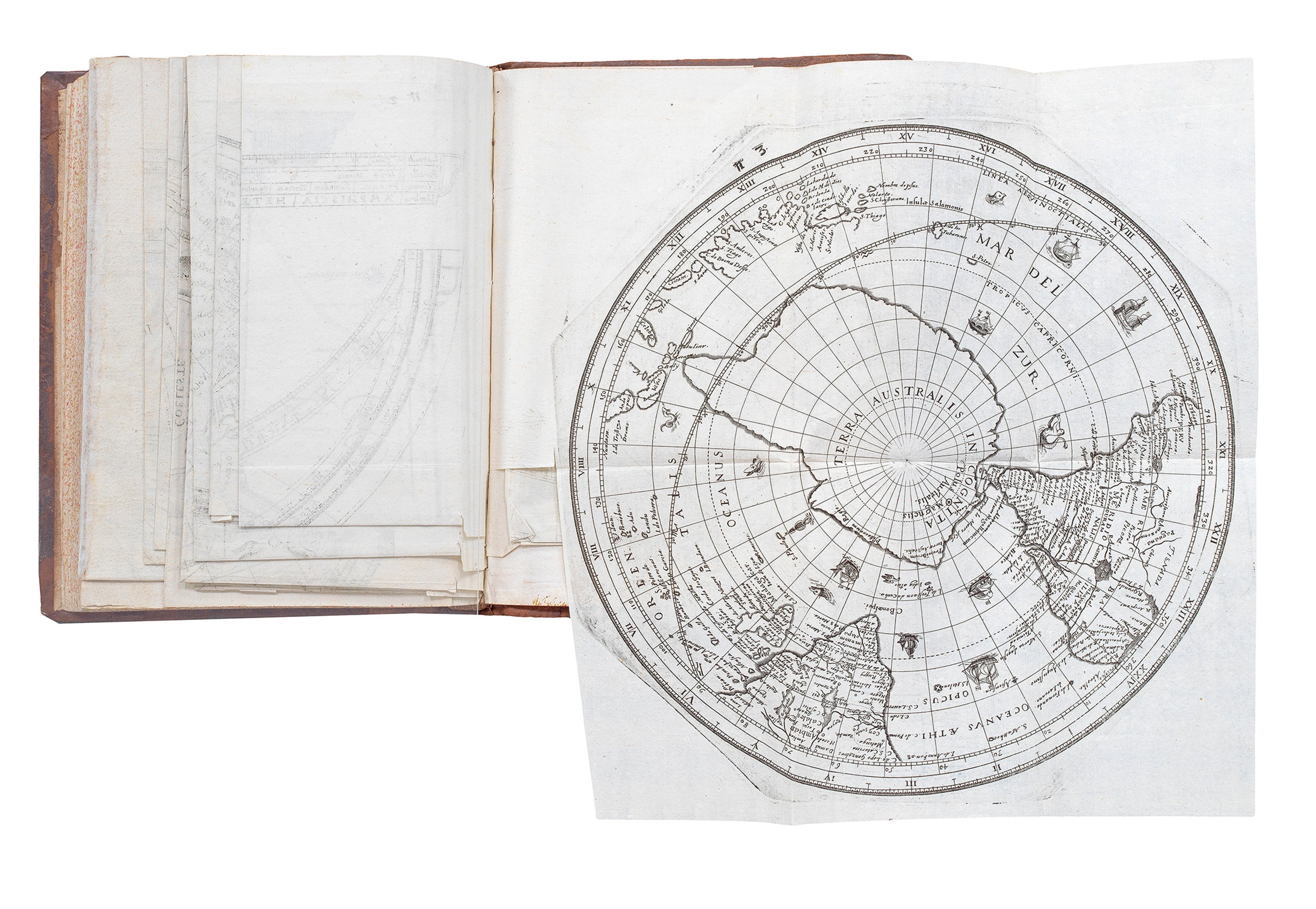 Sturm also included two world maps using polar projections and supplemented them with 10 folding engravings. The planispheres employ a concave perspective, in which the disc appears to sink back into the page. The Earth is then divided into two halves of a perfect sphere, and the equator serves as the diameter of their diagram.