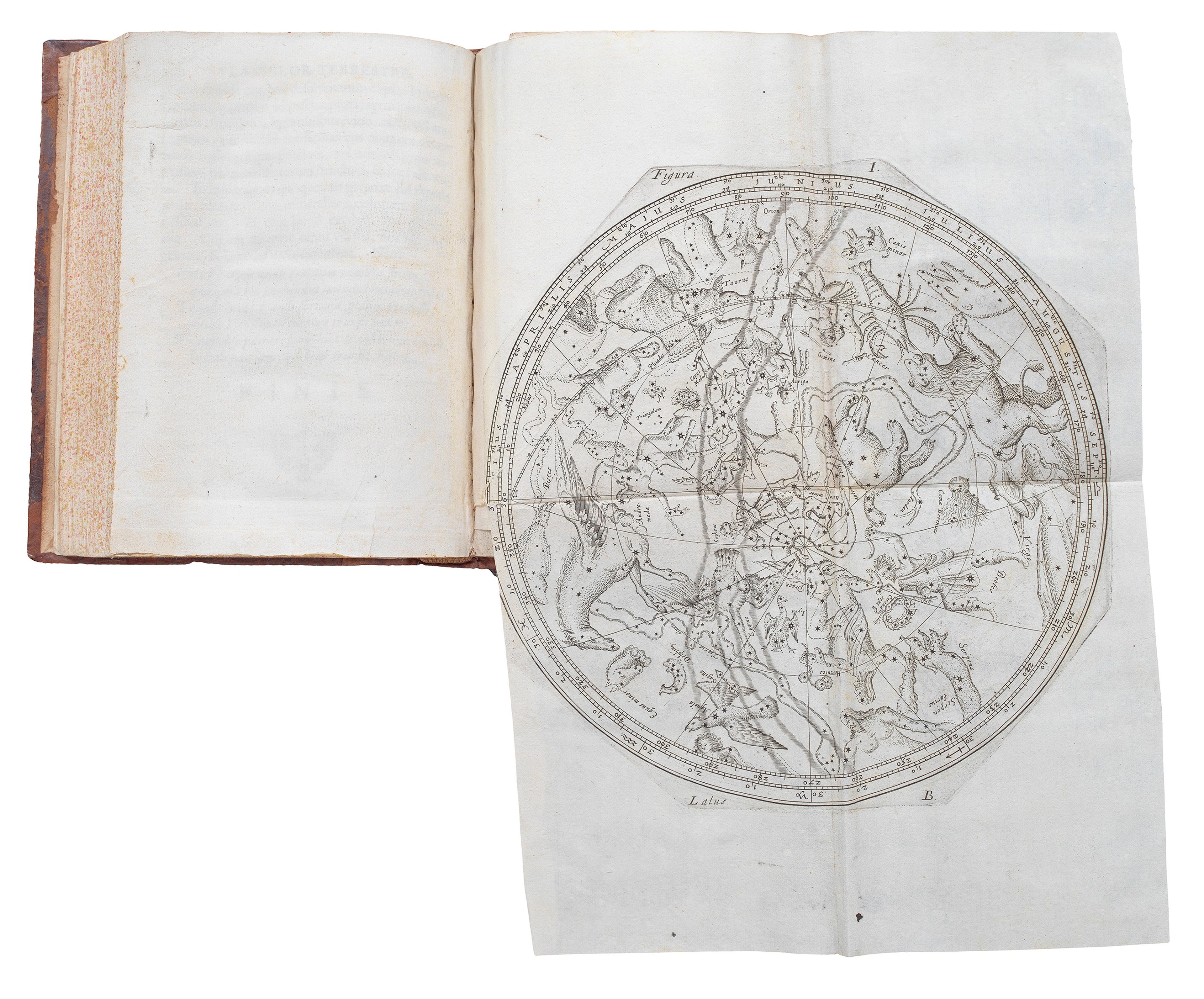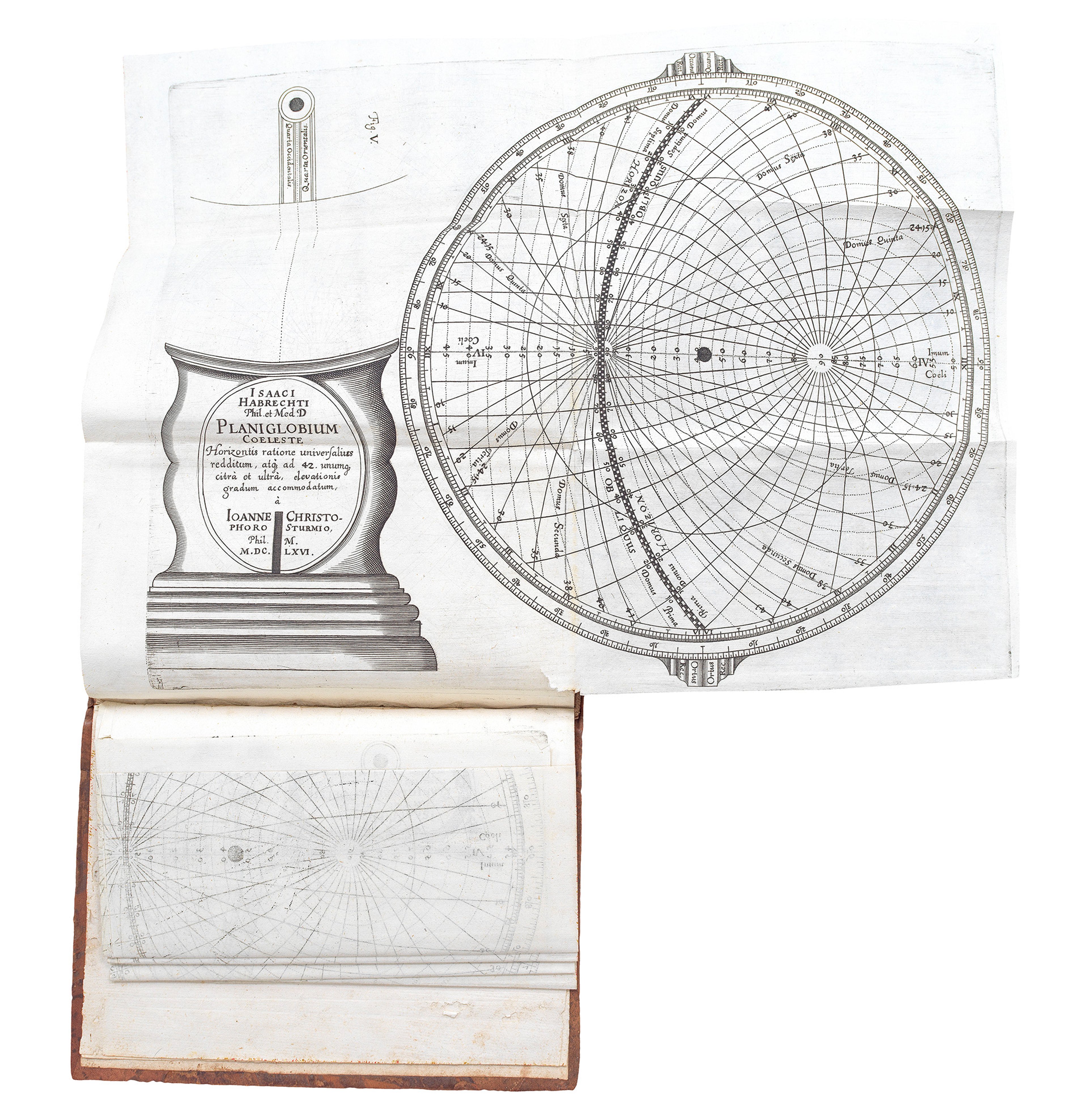 In 1662, Sturm began embellishing and enhancing Habrecht’s text, enlarging on his work with both additional text and new plates. It was published in 1666. This edition included the famous celestial planispheres based on polar stereographic projections, which depict the constellations of the northern and southern skies.