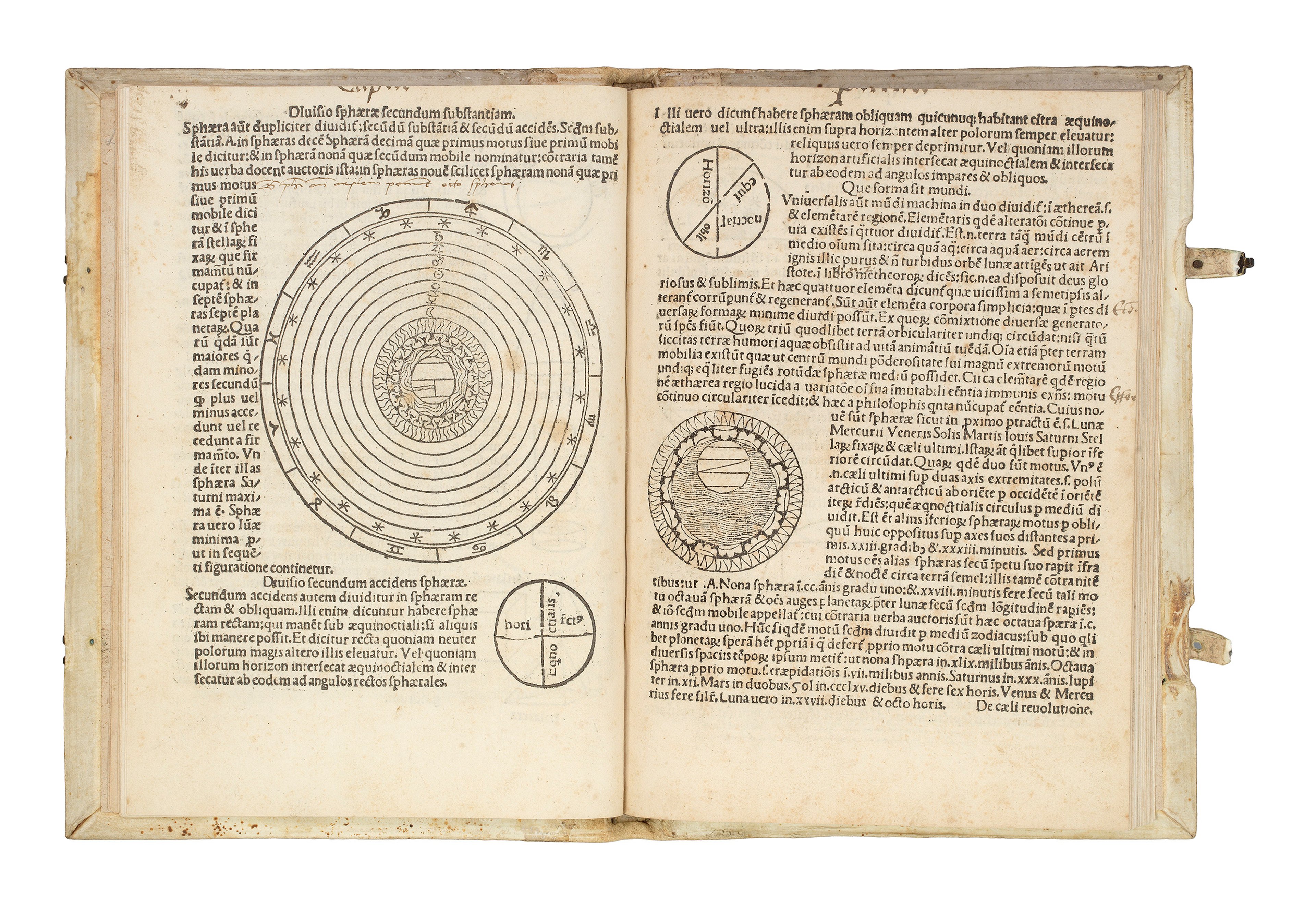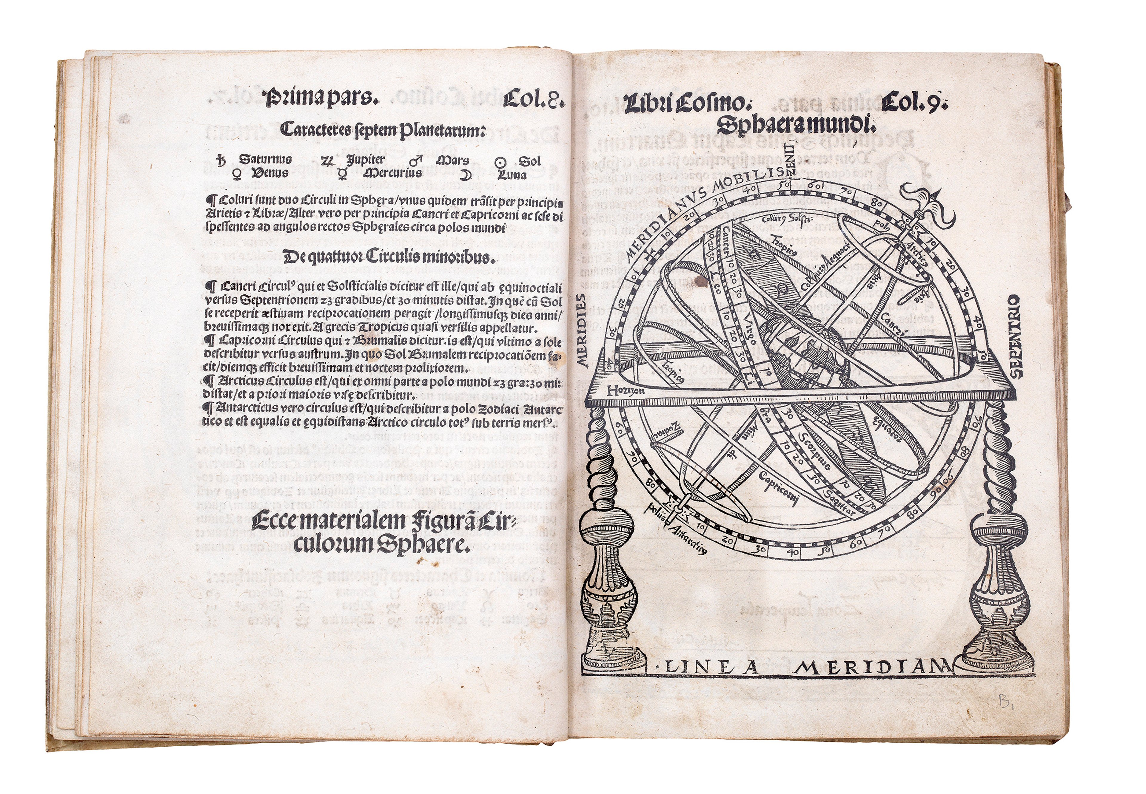 Central to 'De Sphaera Mundi' is Sacrobosco’s description of the heavens as a “sphere of the world”: a solid body containing the planets and constellations. Following the theories of the ancient Greek astronomer and mathematician Theodosius of Bithynia (first century BCE), Sacrobosco divided the cosmos into nine spheres: The 'primum mobile', or prime mover; the firmament of fixed stars; Saturn; Jupiter; Mars; The Sun; Venus; Mercury; and the Moon.