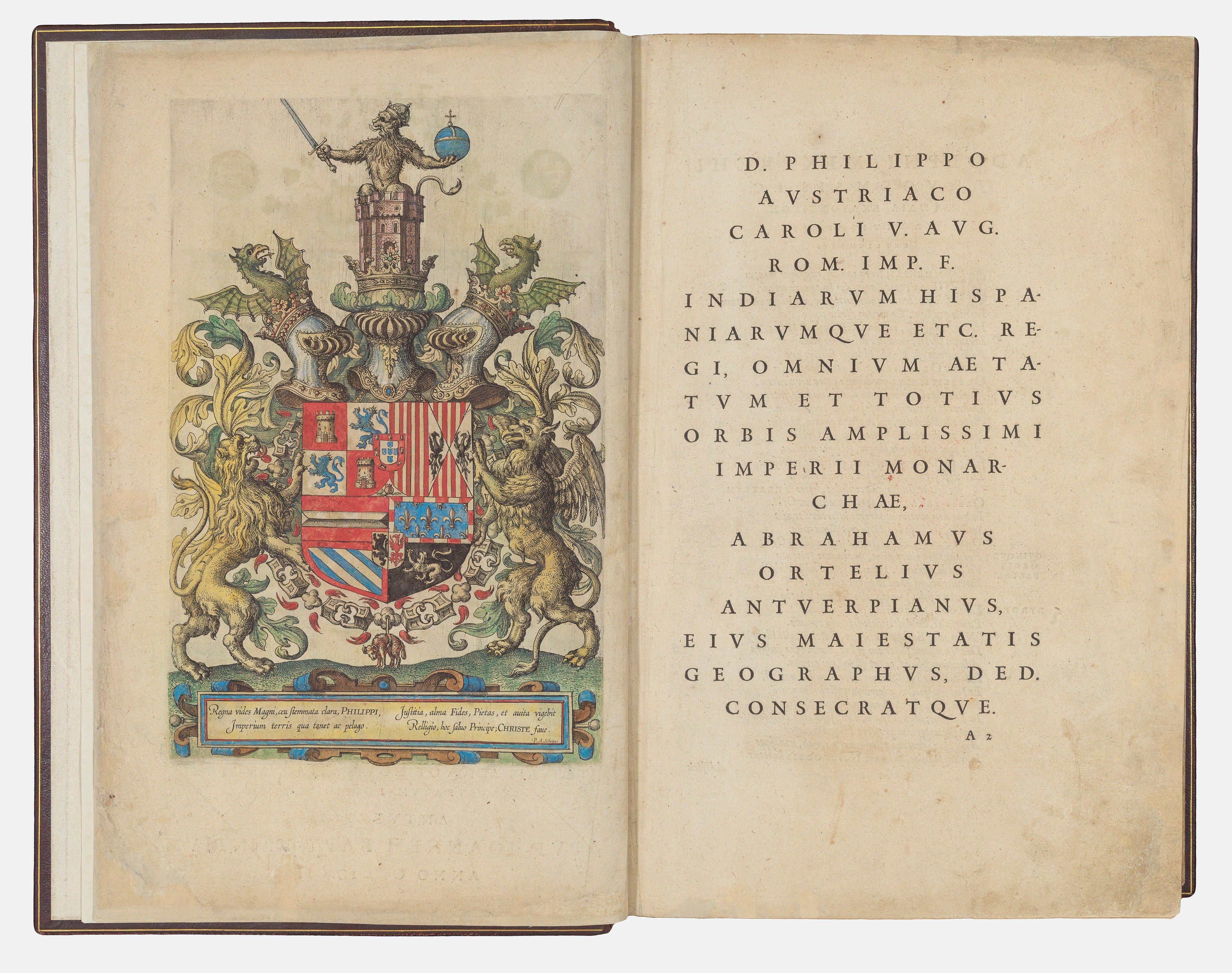 A frontispiece is a decorative, large-scale illustration found at the start of a book or atlas, opposing the title page. Typically, frontispieces are artworks spanning the whole page. The term ‘frontispiece’ comes from the Latin ‘frontispicium’ (‘frontispice’ in French). ‘Frons’ means forehead and ‘specere’ translates as ‘to look at’. Thus, a frontispiece presents the face of the book. It captures the reader’s attention and sets the tone as their first interaction with the contents of an atlas, codex, chronicle, or other work.