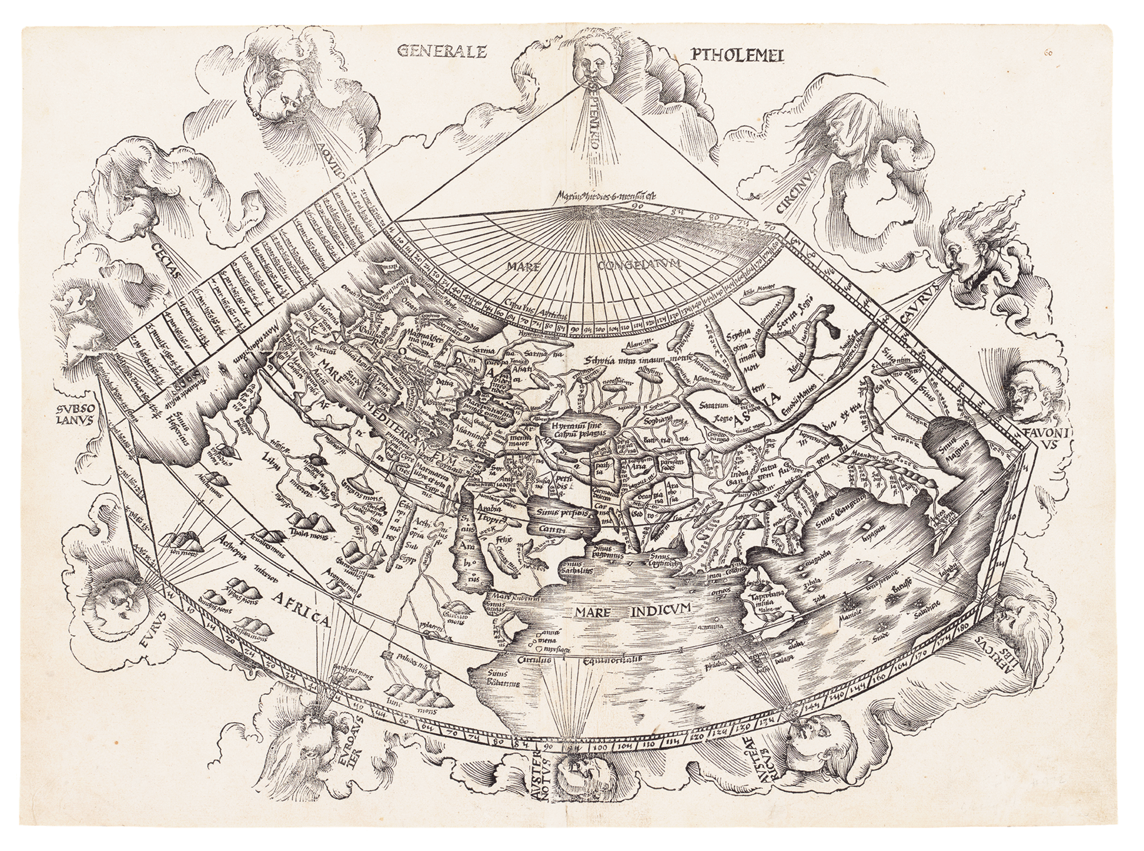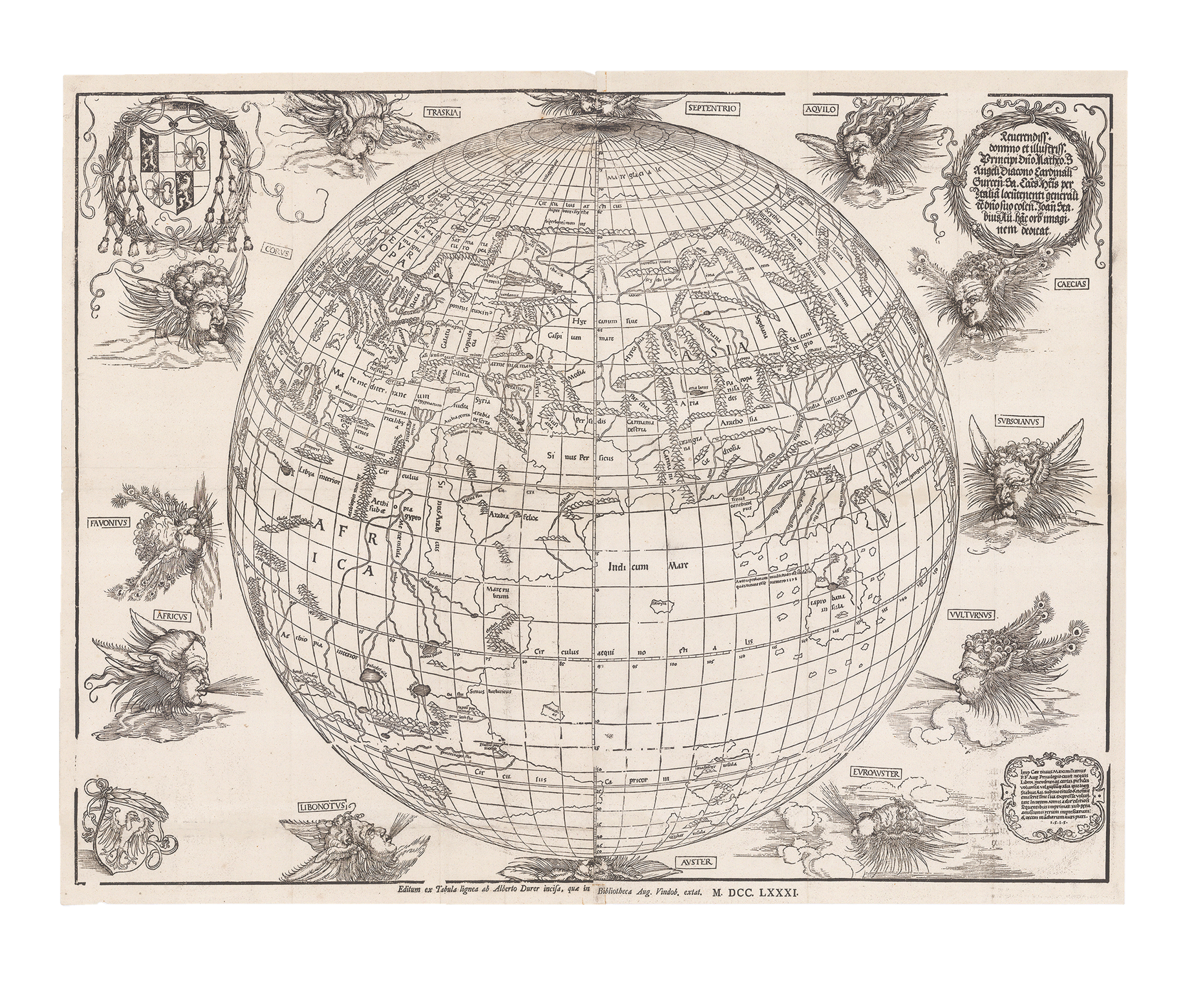 The pioneering mapmaker Martin Waldseemüller represented the heads morphing in and out of a blanket of clouds on his 1513 Ptolemaic world map and, in 1515, Albrecht Dürer transposed the ancient windheads into a distinctly modern depiction of the globe as a perspectival sphere.