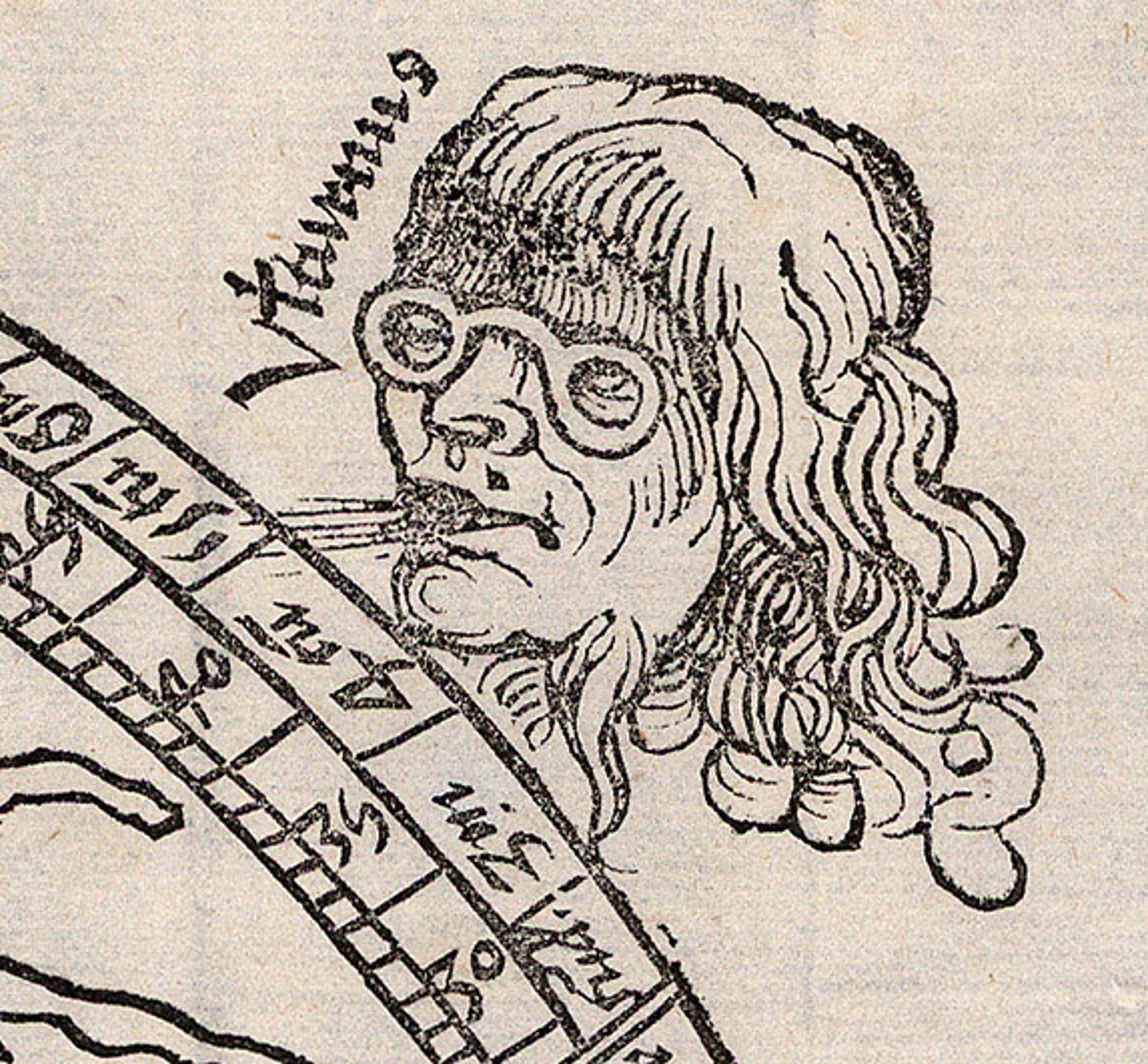Martin Waldeseemüller entangled the windheads in billows of dark clouds, evoking a stormy and fierce atmosphere, as seen here on his Amended Ptolemaic World Map, 1513.